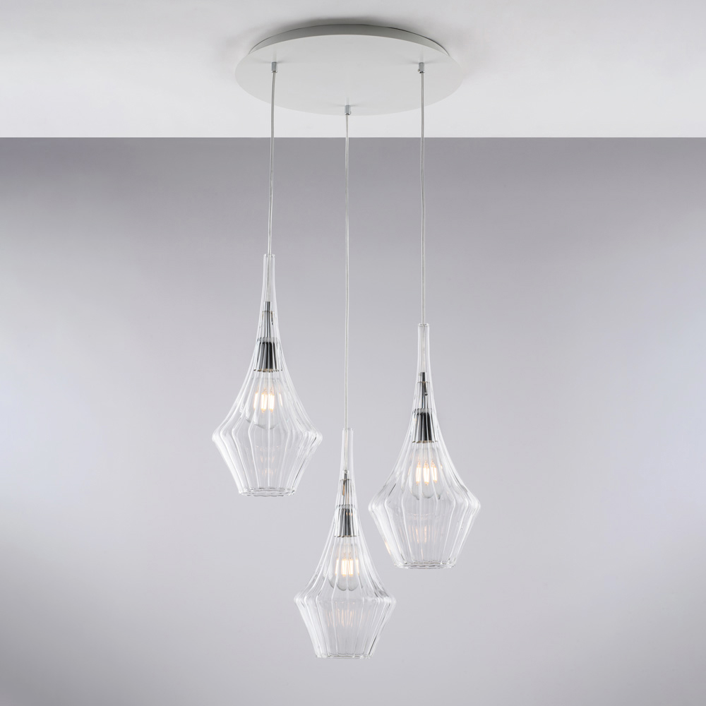 Elegant and luminous, this handcrafted iron pendant with Pyrex glass is a lighting solution with a contemporary and refined feel. The three Pyrex glass diffusers , with their geometric and faceted shapes, harmoniously diffuse the light, creating a light and sophisticated visual effect.