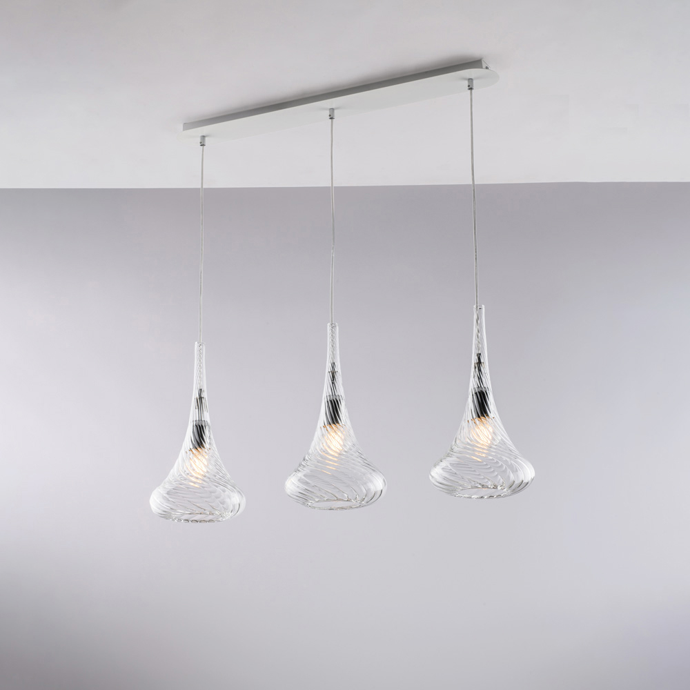 Streamlined and elegant, this handcrafted iron track pendant with Pyrex glass is a contemporary lighting solution, ideal for those seeking a balance between functionality and aesthetics. The three Pyrex glass diffusers , with their soft, slightly flared shapes, are suspended along a horizontal track, ensuring even light distribution and a harmonious visual effect.