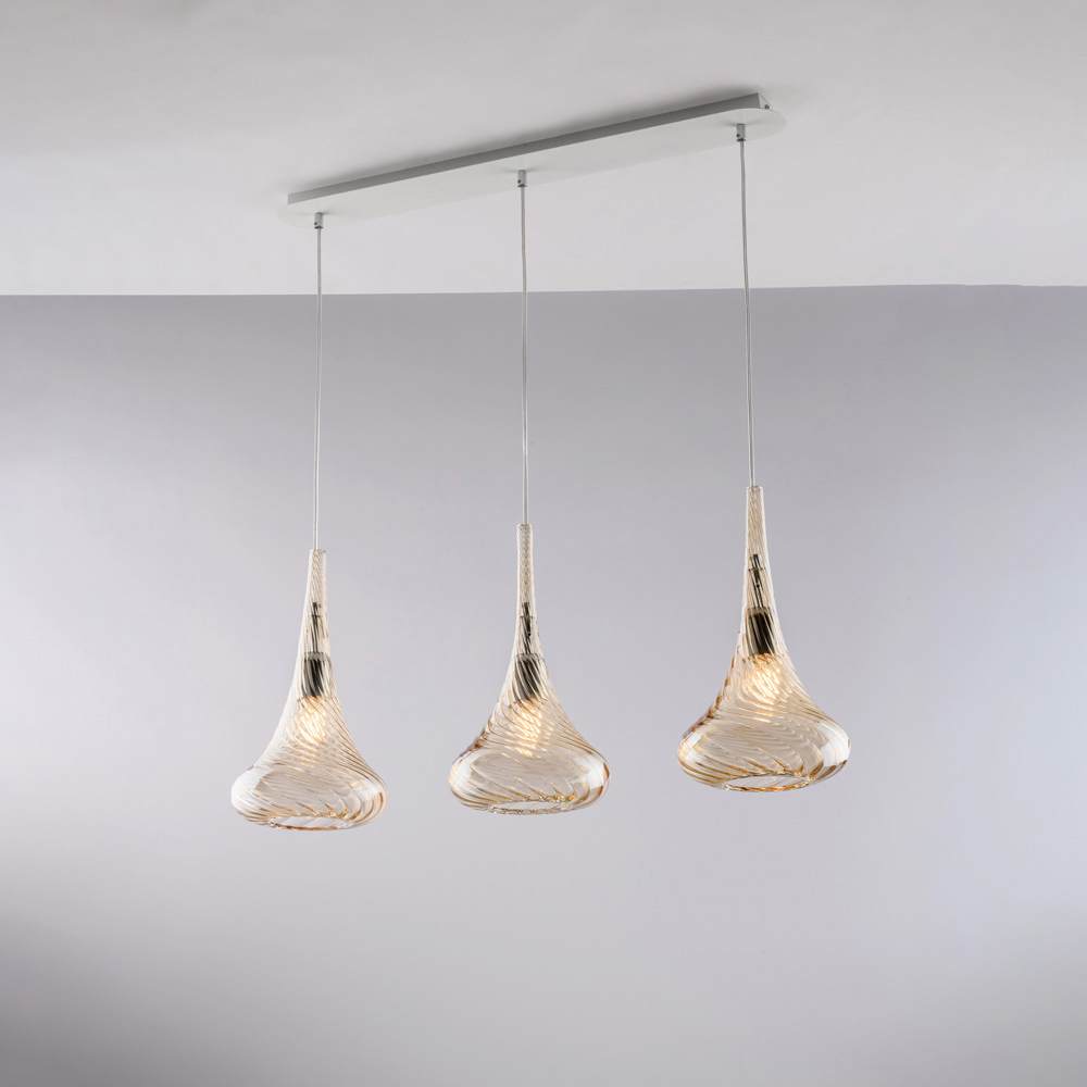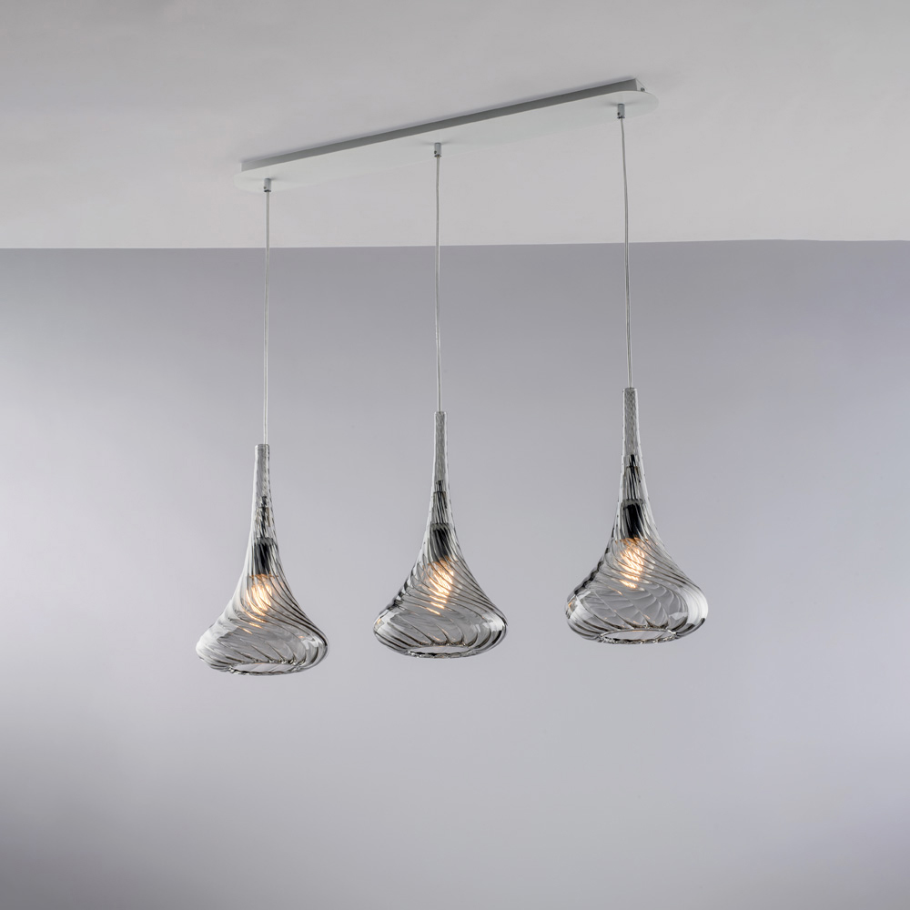 Available in Transparent , Amber , or Grey finishes, this pendant light allows you to customize the atmosphere of your space: bright and minimal in the transparent version, warm and enveloping in amber, elegant and modern in grey. It is perfect for kitchen islands , dining tables , counters , open spaces , and designer contract environments .