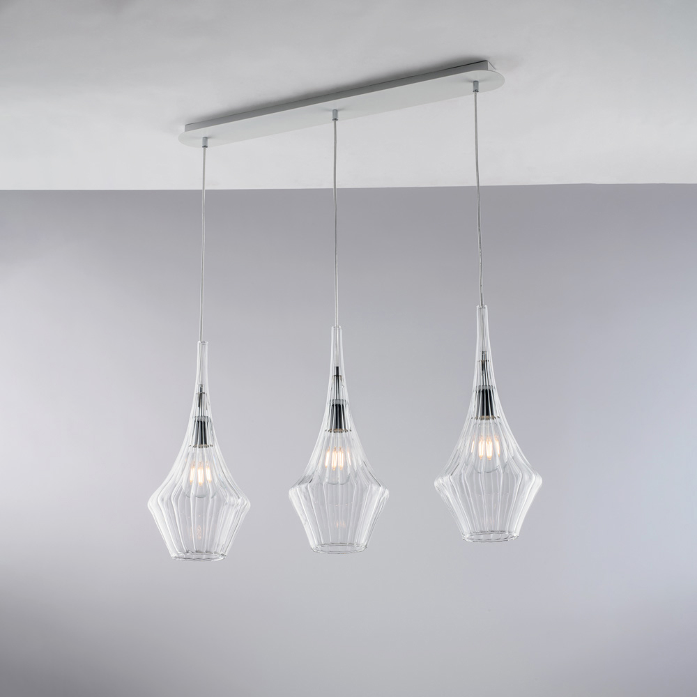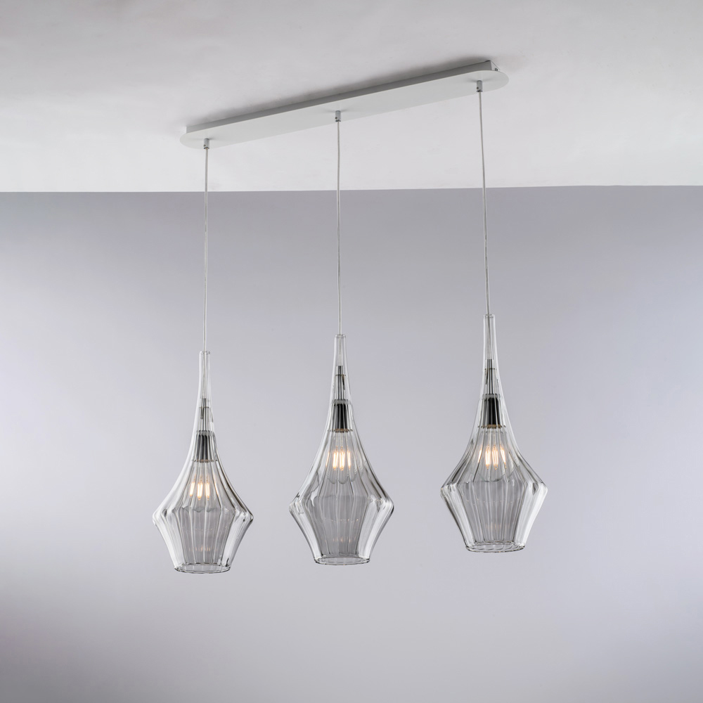 Streamlined and elegant, this handcrafted iron track pendant with Pyrex glass is a contemporary lighting solution designed to enhance spaces with balance and refinement. The three Pyrex glass diffusers , with their faceted and harmonious shapes, spread light evenly, creating a luminous and sophisticated atmosphere.