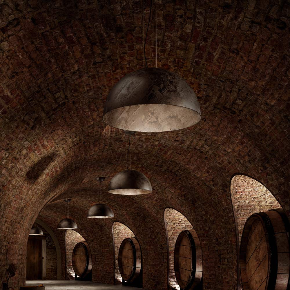 The firm graphic line and the perfect half sphere characterize this collection of lamps, designed as a tribute to the astronomical revolution. The contrast between the outer look made of brass or iron and the interior one done with gold, silver or copper foil, ascribes this product an aesthetic value of great visual effect. Available in brass or iron exterior for diameters 30, 40, 60 cm and in iron exterior for diameter 80 cm.