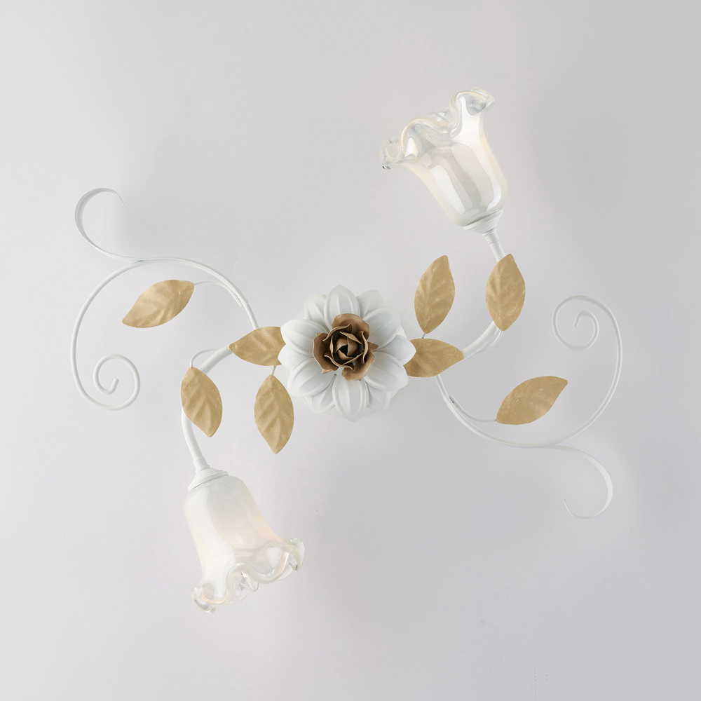 Refined and decorative, this classic handcrafted ceiling light in ivory-lacquered iron is a luminous creation with a strong romantic character. The floral structure, embellished with sinuous curls, decorative leaves, and flower-shaped glass diffusers , lends the ceiling a light and harmonious elegance, transforming the light into a true decorative element.
