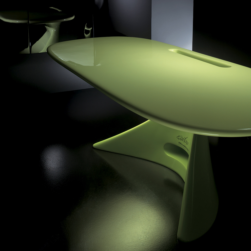 This desk features a self-supporting body, made by molding thermosetting resins and reinforced with glass fibre.