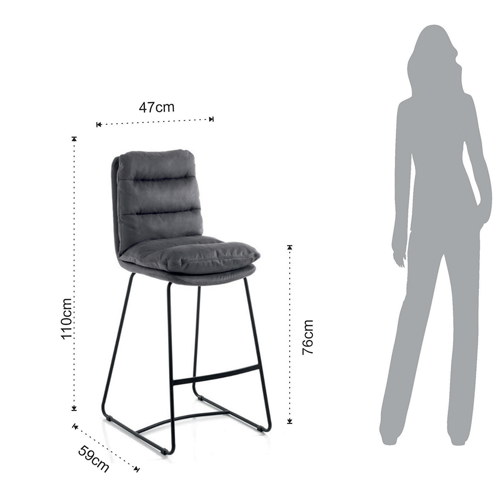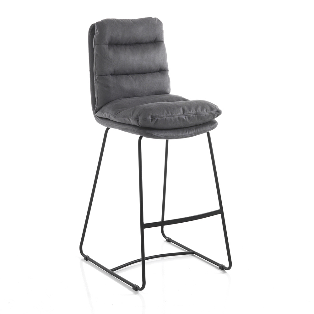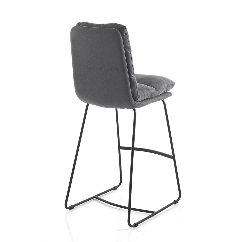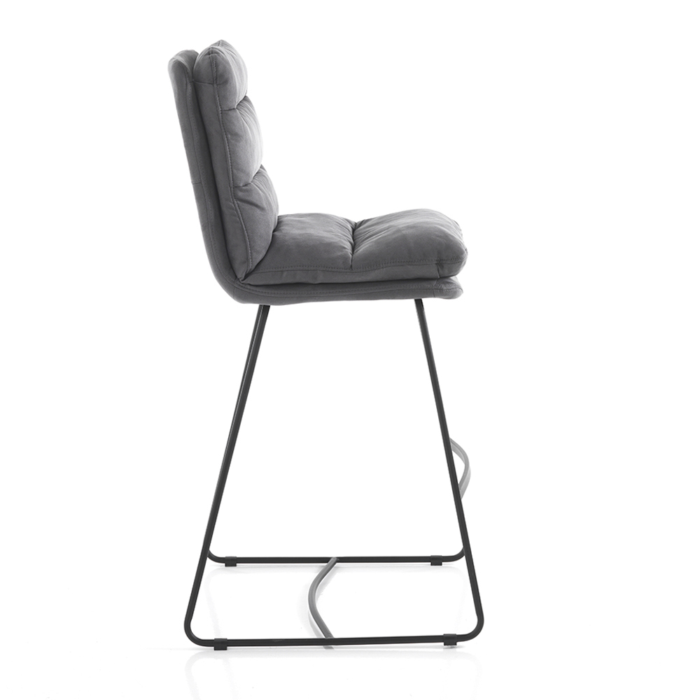 High kitchen stool with sled structure made of matt black painted steel complete with practical footrest and padded seat covered in soft gray velvet effect microfibre . A product whose aesthetics are marked by simple lines and shapes enriched by the elegant quilting that covers the entire seat, giving an even greater sensation of comfort. Ideal to place in the dining room and kitchen but also within contract spaces such as bars and restaurants thanks to the elegant and refined design and its versatility of use.