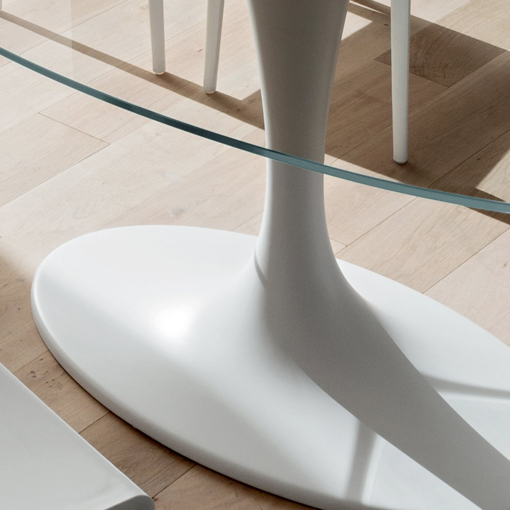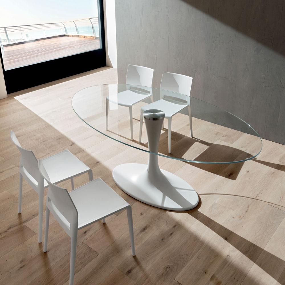Dining table made in Italy with oval top in tempered glass (thickness 12 mm) glossy transparent finish with glued steel flange and base in mineral marble (synthetic marble), a material obtained by mixing marble powders. From the encounter between quality raw materials and original shapes, an extremely creative furnishing solution is born that makes every dining room or kitchen an almost futuristic environment. What characterizes its aesthetics, making it a unique product of its kind, is the synthetic marble base which, in addition to offering excellent stability, enriches it with its strong modern personality together with the glass top, a particularly versatile and at the same time elegant. The end result is an eclectic and unusual piece of furniture, ideal for those who love to furnish their home spaces with elements with an avant-garde and refined style that attract attention thanks to their revolutionary soul to thus create a wonderful harmony of styles.