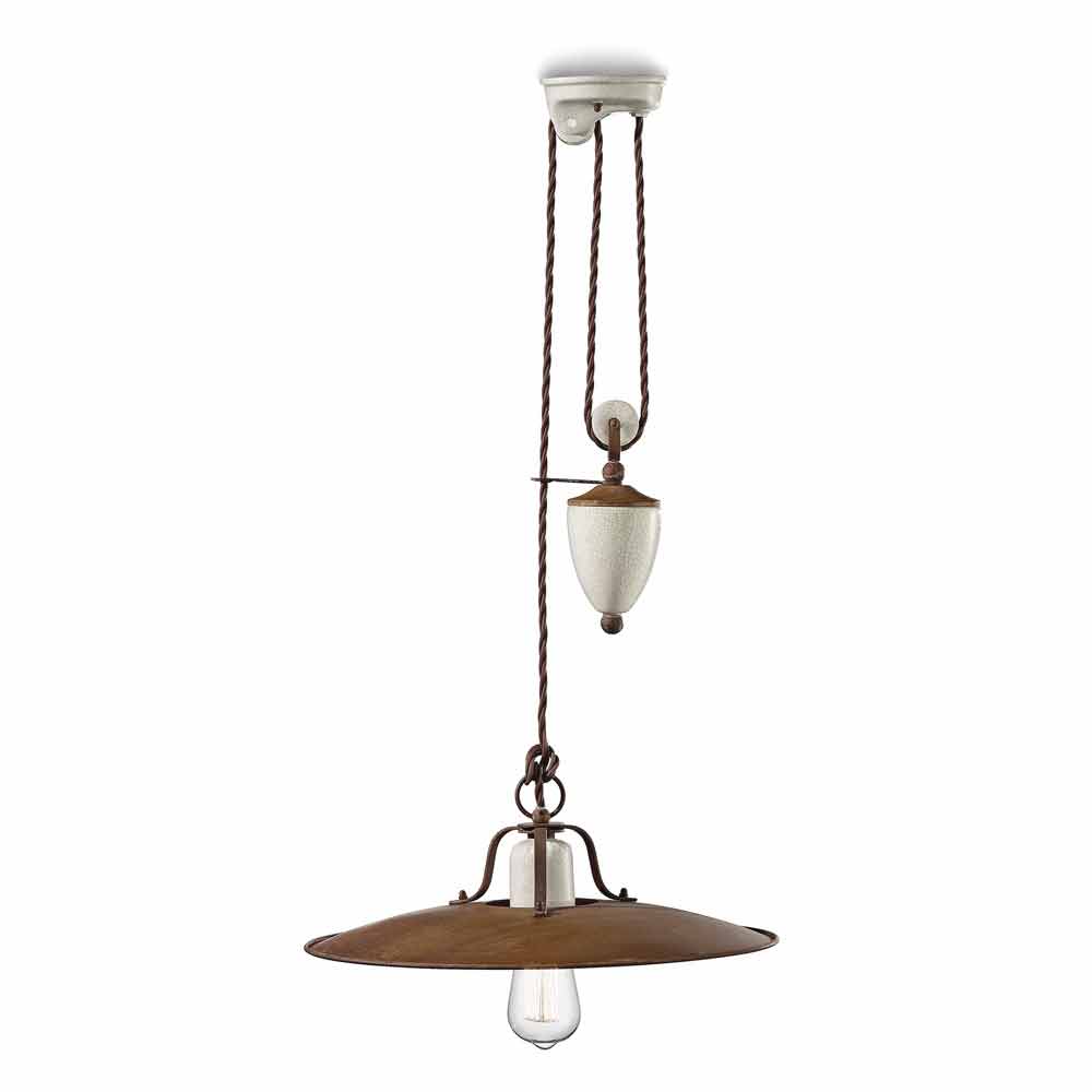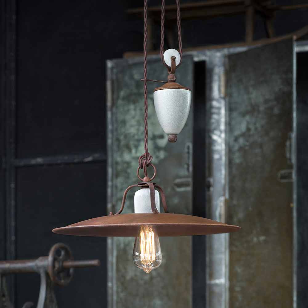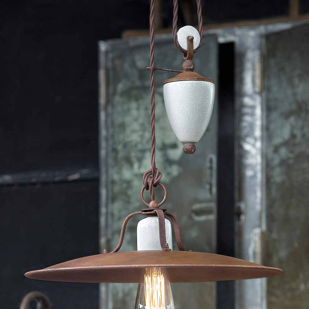 This beautiful lamp consists of a large metal crown, in a matt rust finish, supported by a braided cable that completes its industrial style and thanks to which you can easily adjust its height, while the ceramic parts that make it up are worked. with craquelé details, to complete a balance of full and empty shapes. It is these materials that give Kristen this role of recalling the past.
