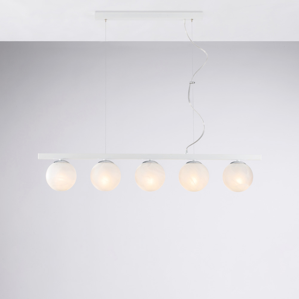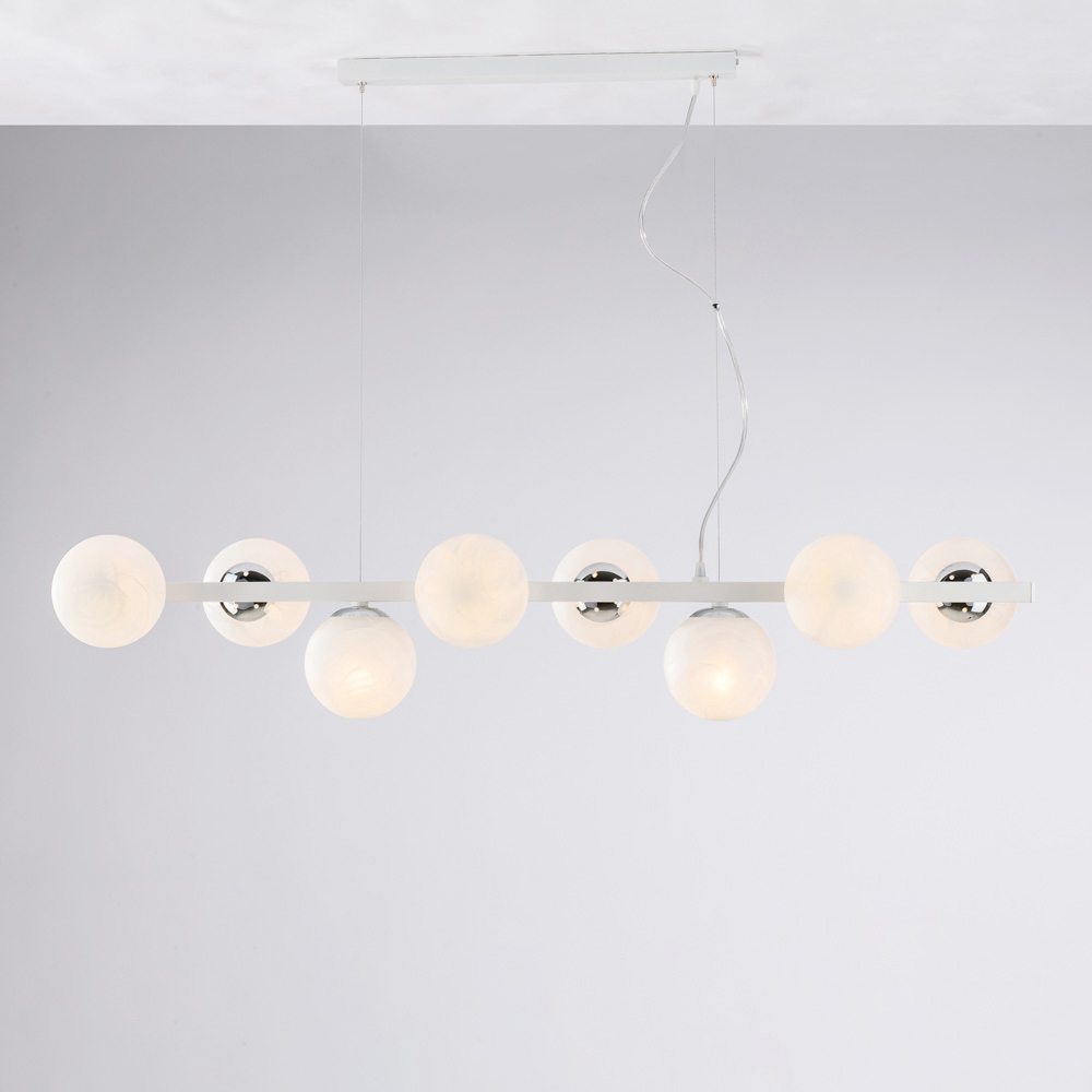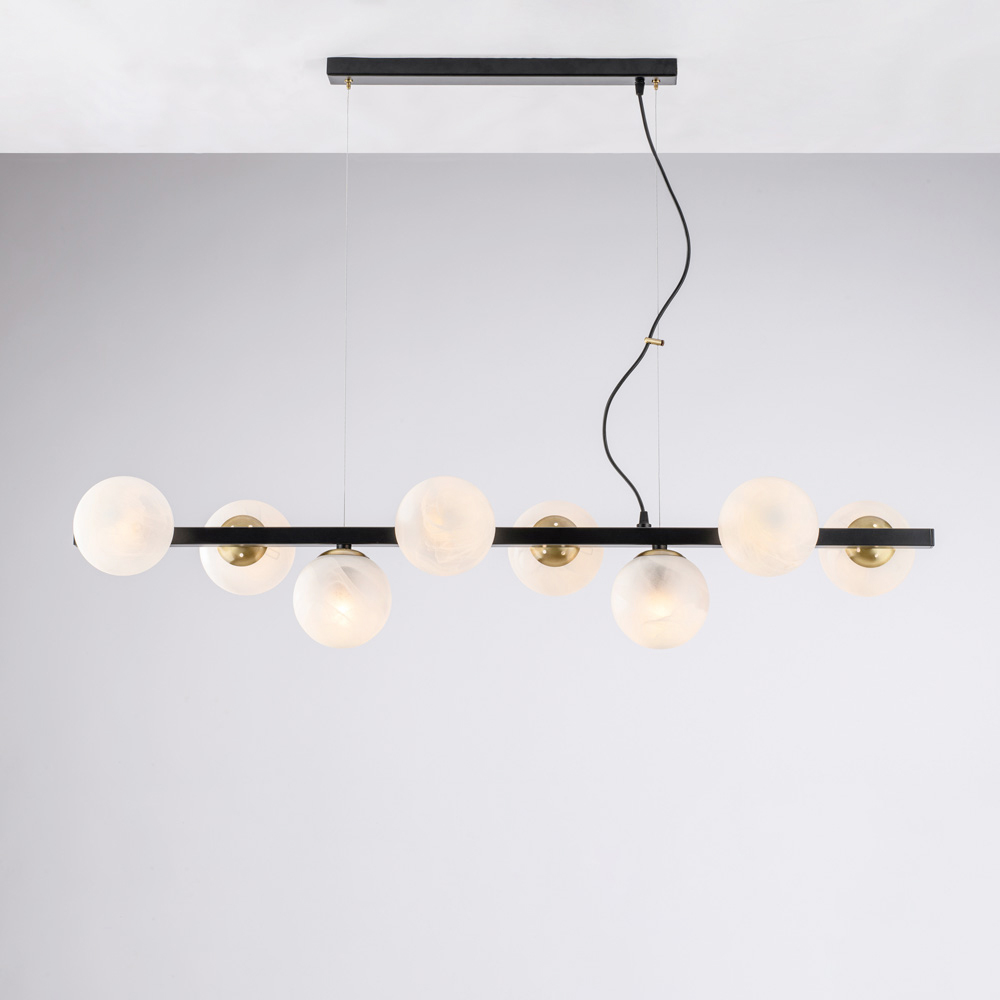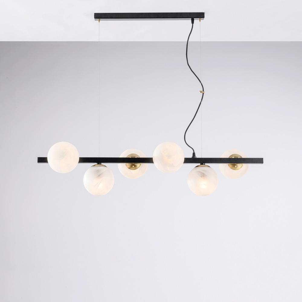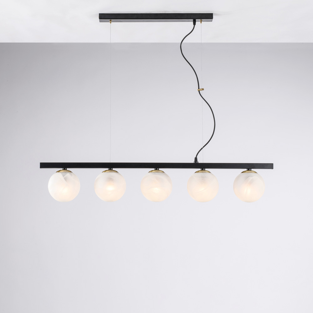 Modern, elegant, and visually striking, this handcrafted iron pendant lamp is designed to enhance contemporary spaces with a diffused, dramatic light. The linear structure, enhanced by sequential luminous spheres , creates a perfect balance between geometric rigor and visual softness.