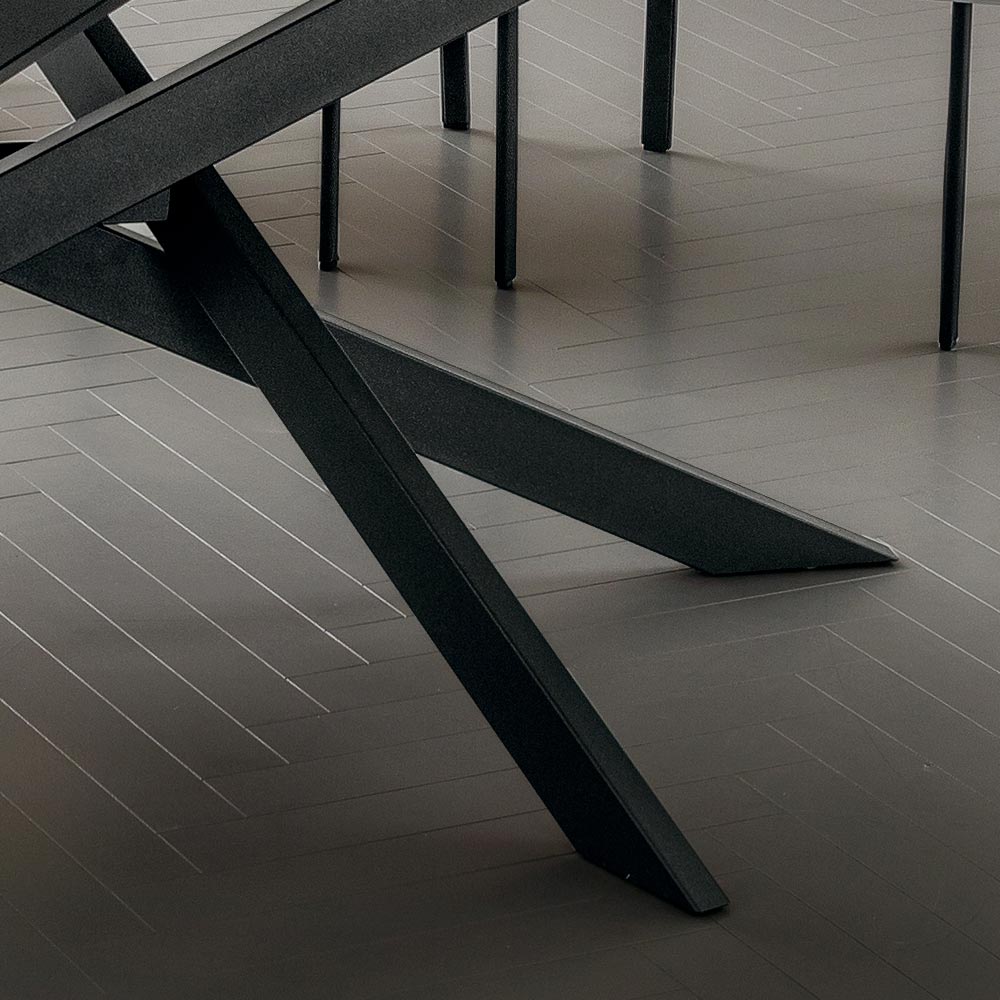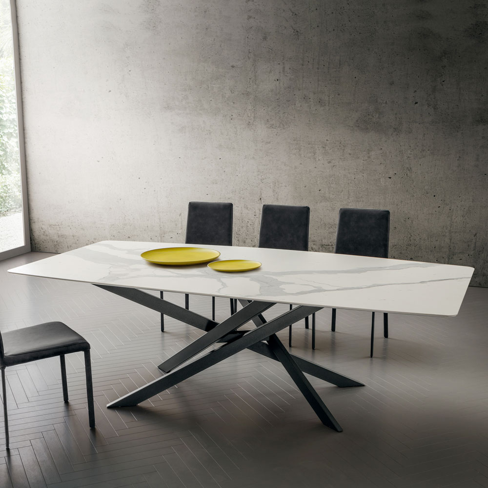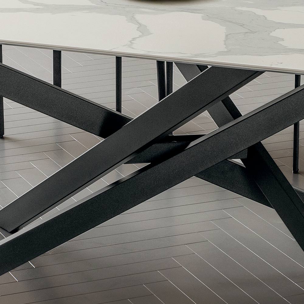 refined and original aesthetic that characterizes every environment bringing with it elegant and refined elements that are modern and creative at the same time. The peculiarity of this table is the base with crossed legs which enriches its design by revolutionizing the style of the entire room of which it becomes the protagonist, conquering every attention. The wonderful barrel top completes the final look of the table giving a
