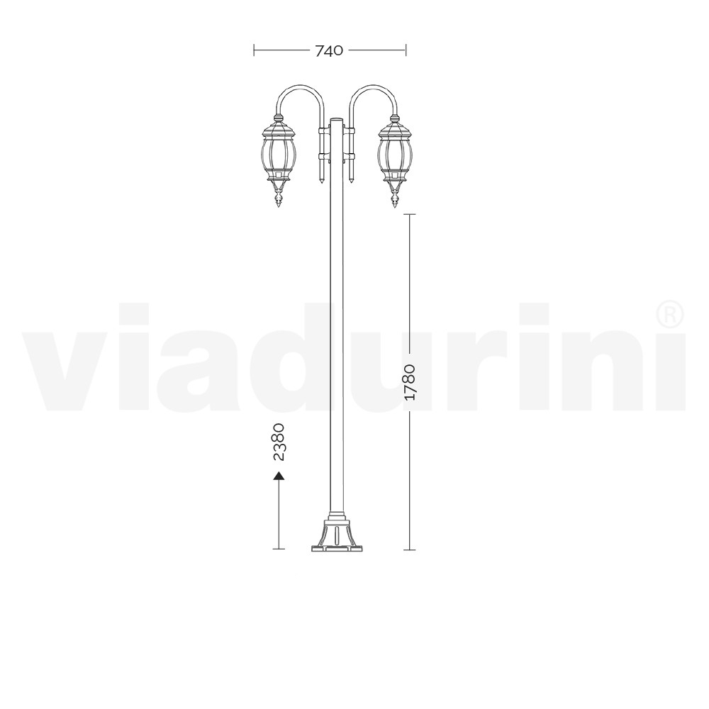 2-light garden lamp made through 100% Made in Italy production in die-cast aluminum in anthracite gray finish with transparent polycarbonate diffuser. Complete with stainless steel screws. A furnishing accessory for outdoor spaces with a strong vintage personality and a romantic style characterized by wonderful refined and carefully crafted details which underline its elegance. Ideal for outdoor environments such as gardens, avenues, walkways or outdoor contract spaces such as bars and restaurants.
