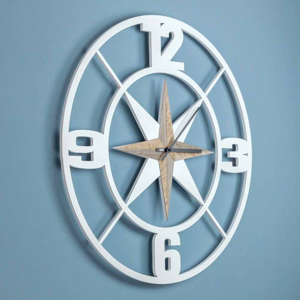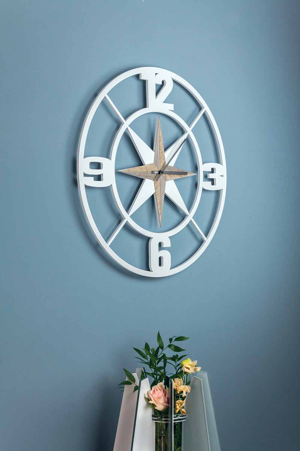 Large wall clock in shabby style, round design in white and brown wood, made in Italy.
