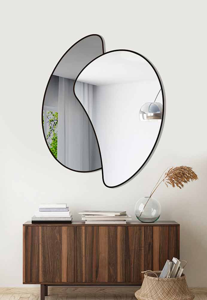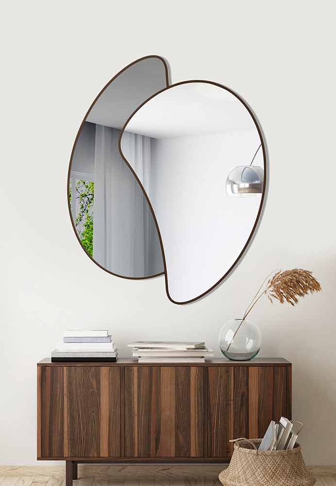wall mirror is made up of two mirrors, one of which is a smoky color, with elegant lines and modern shapes combined with refined lacquered finishes for a result with a minimal and decorative aesthetic impact, in a unique style.