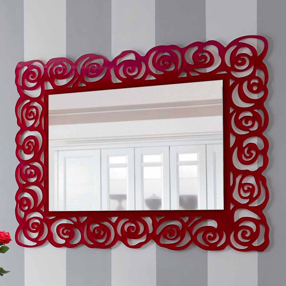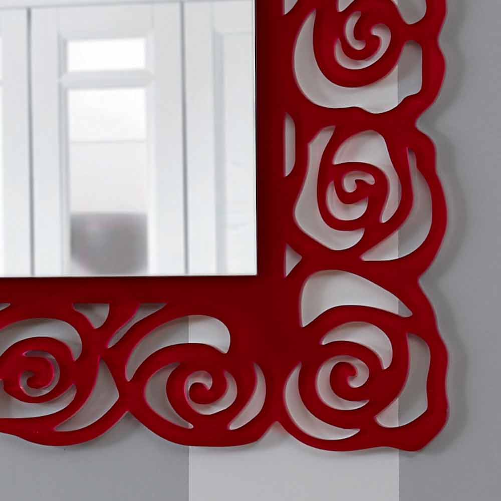 Mirror of modern and elegant rectangular design, with frame of roses in red plexiglass, made in Italy.