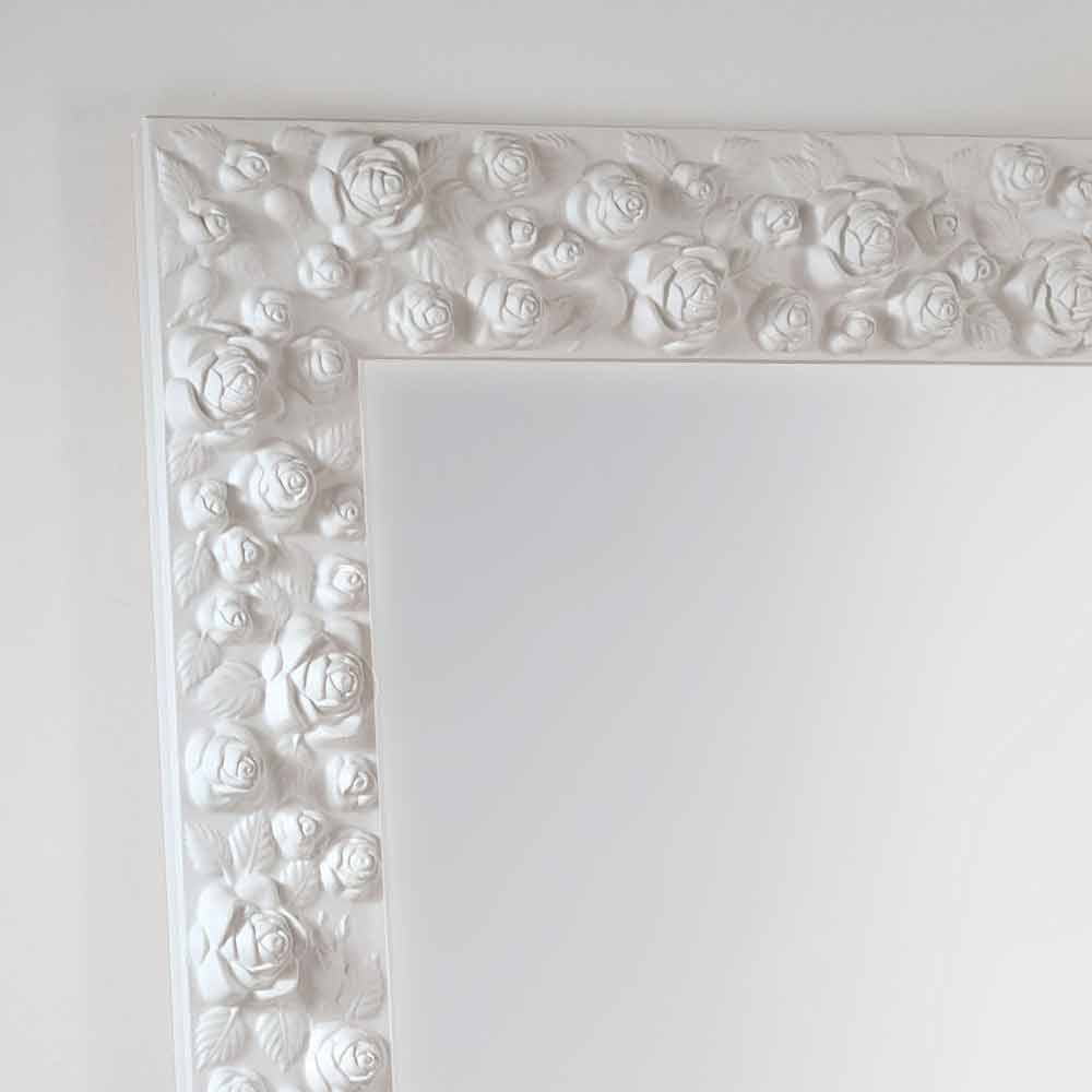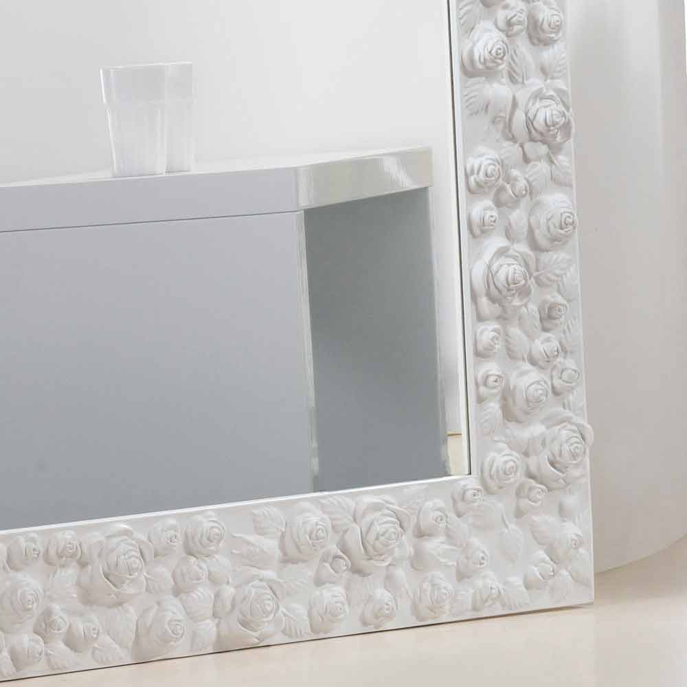 The Flower mirror is characterized by a craftsmanship carried out using quality materials and using the experience of skilled Italian artisans. The frame is made of fir wood, with decorations in the shape of roses in wood paste. The width of the frame is 14.5 cm, for a maximum thickness of 6 cm at the maximum point of the rose relief. White satin finish. Crystal mirror, 4mm thick. Made in Italy.