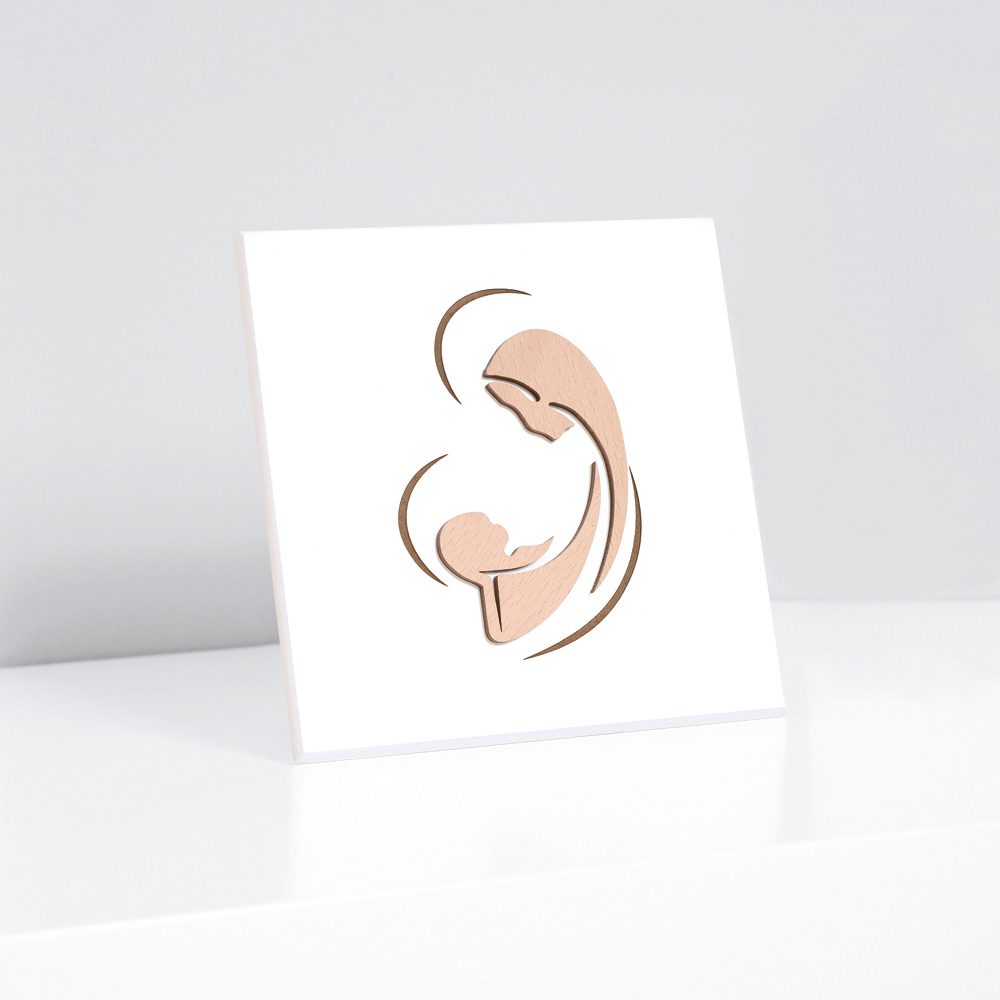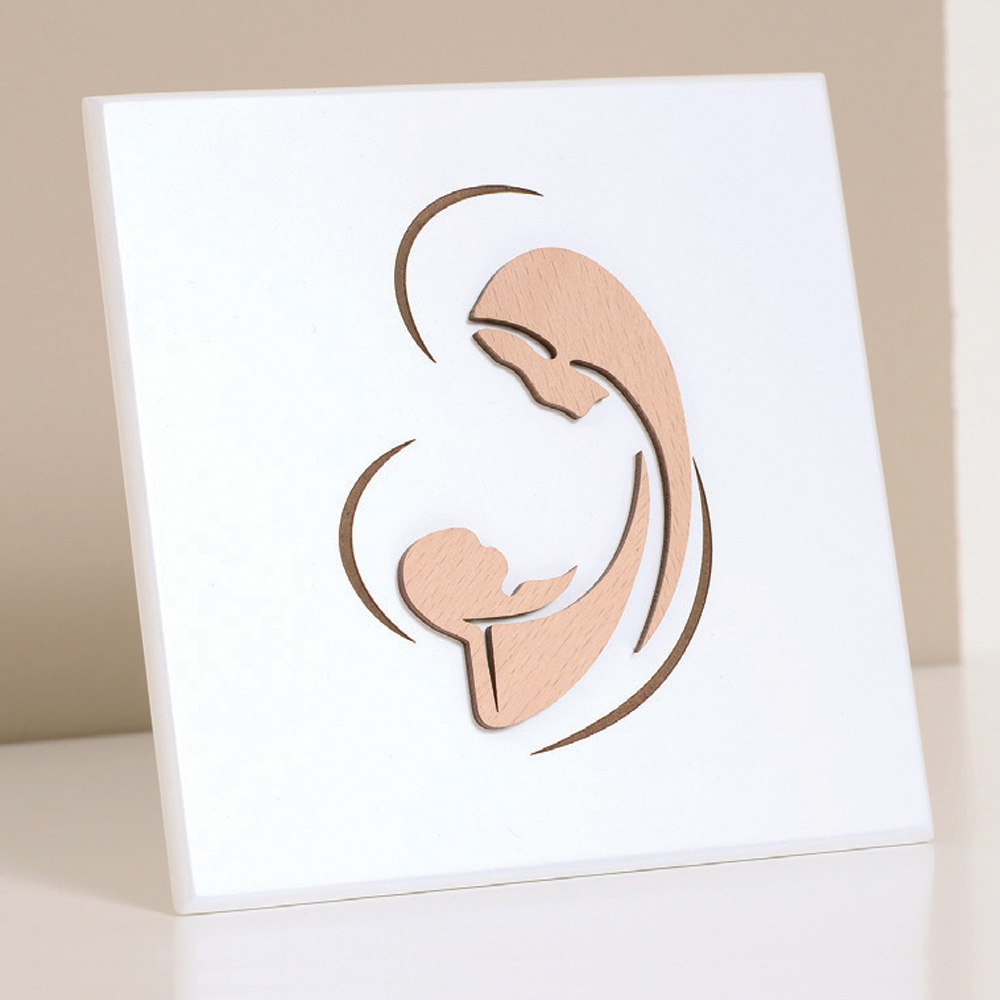 Sacred picture with stylized mother and child , applied in natural wood. White lacquered wooden panel with support foot and hole to hang it on the wall.