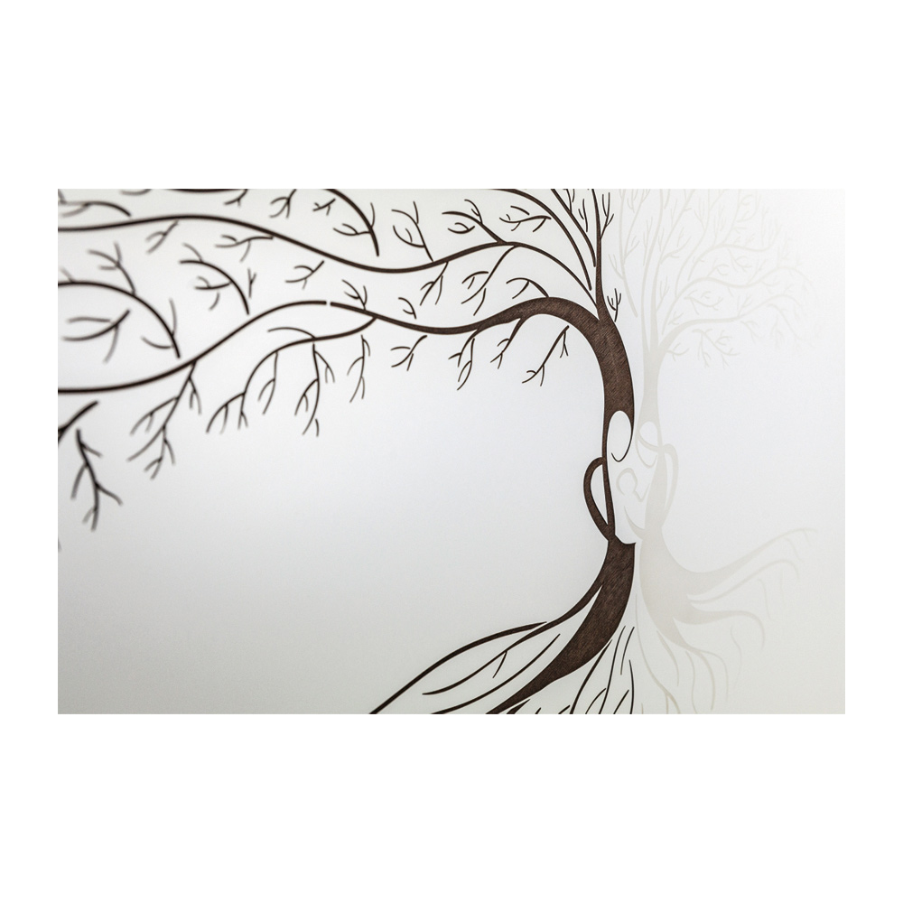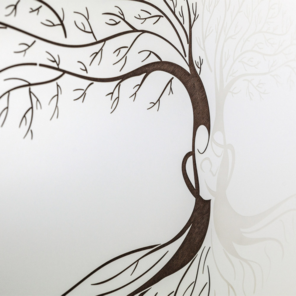 Branches and leaves made with laser marking branch off from the trunk. Framework in matt white lacquered wood with applications in lacquered wood in two shades and laser marking.