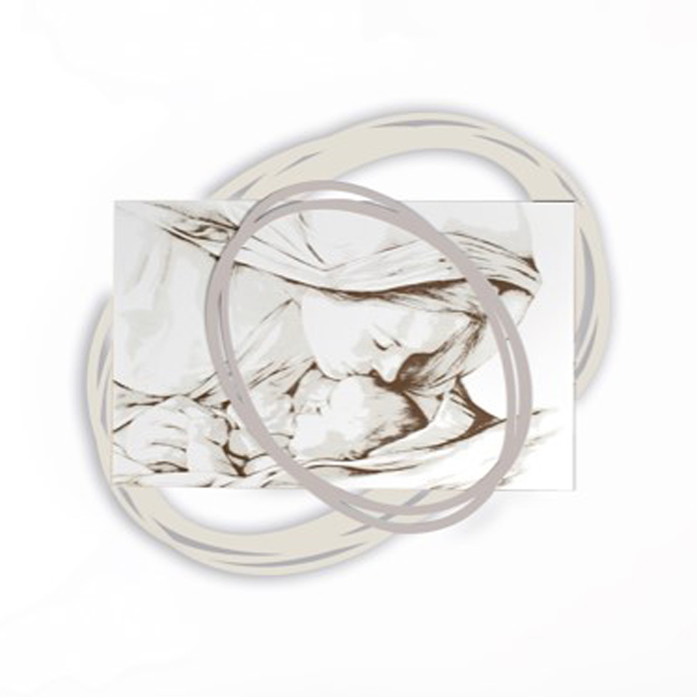 A headboard depicting a kiss from the Madonna to her son thanks to laser marking, which shows the features of the faces. Matt white lacquered wooden panel with laser marking, a special technique that creates a bas-relief on the materials.