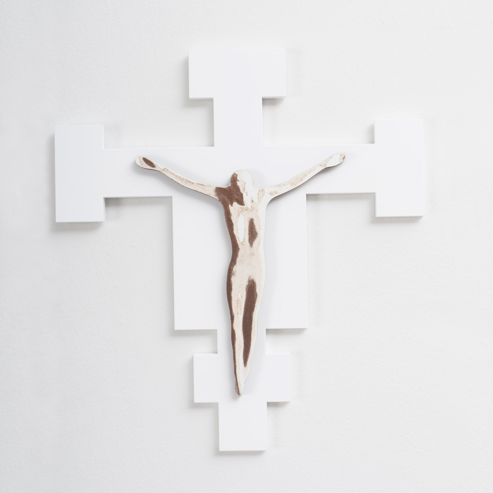 White lacquered wood crucifix with laser engraved white lacquered wood Christ application that highlights the details of the body.