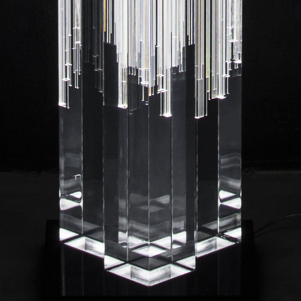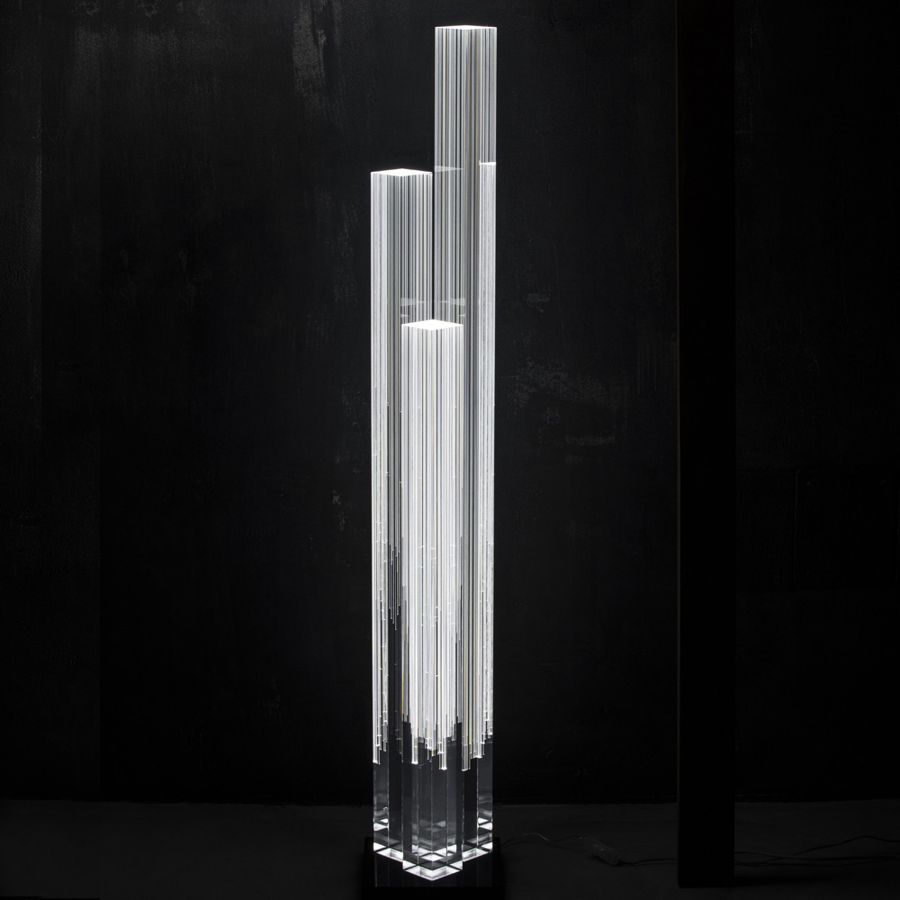 This floor lamp is composed of unique blocks of acrylic crystal cut and engraved with laser technology and a base with the LED lighting body.