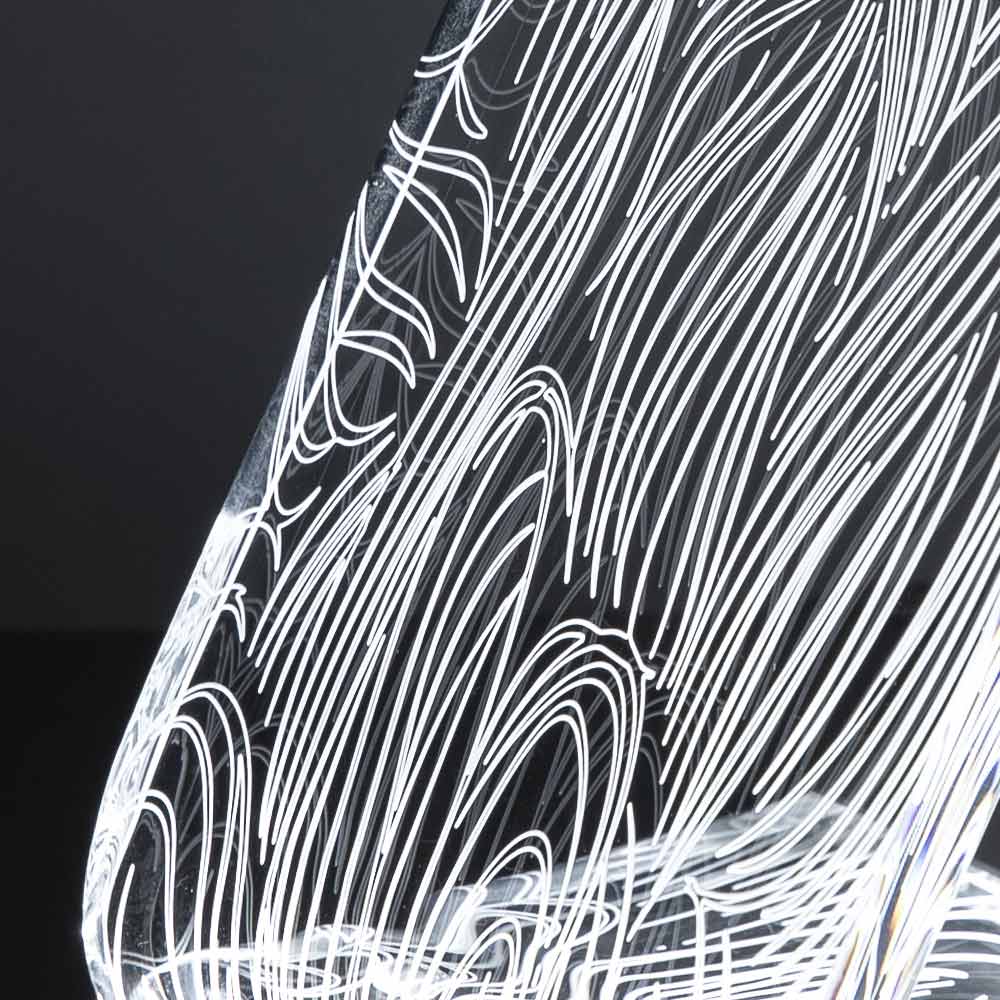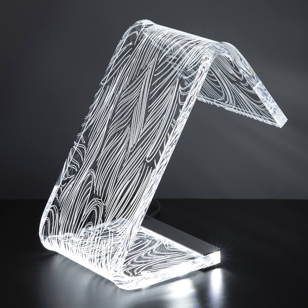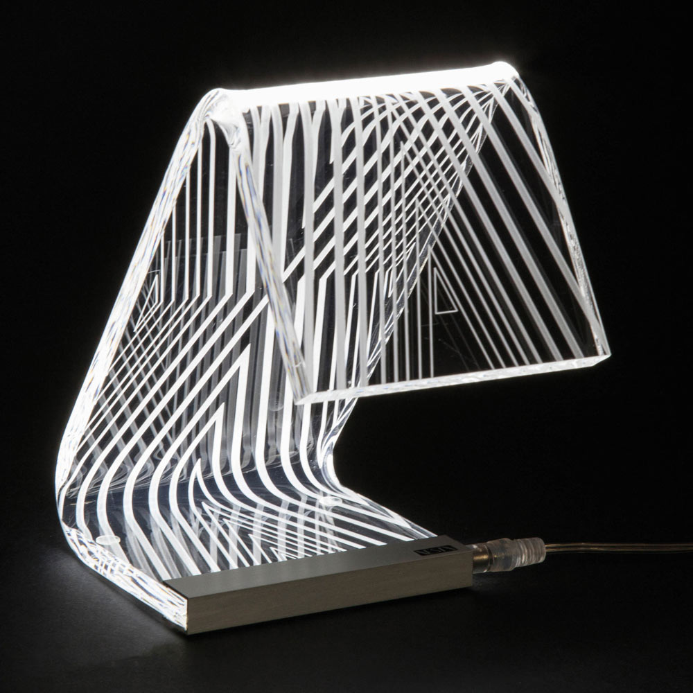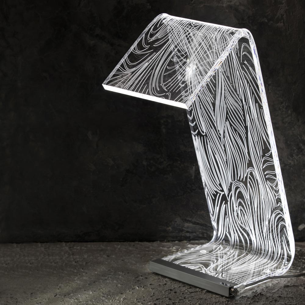 This table lamp   it is entirely made of transparent and hand-bent acrylic crystal with a thickness of 10 mm and is characterized by laser engravings on the surface which, through a LED strip placed at the base, light up along the entire length of the light body, creating an extraordinary play of effect made possible thanks to the physical-technical characteristics of the acrylic crystal.