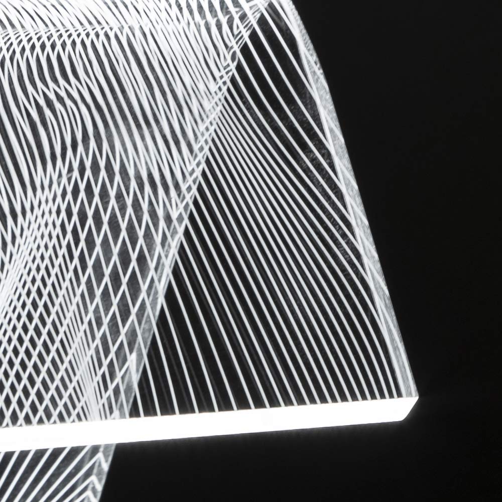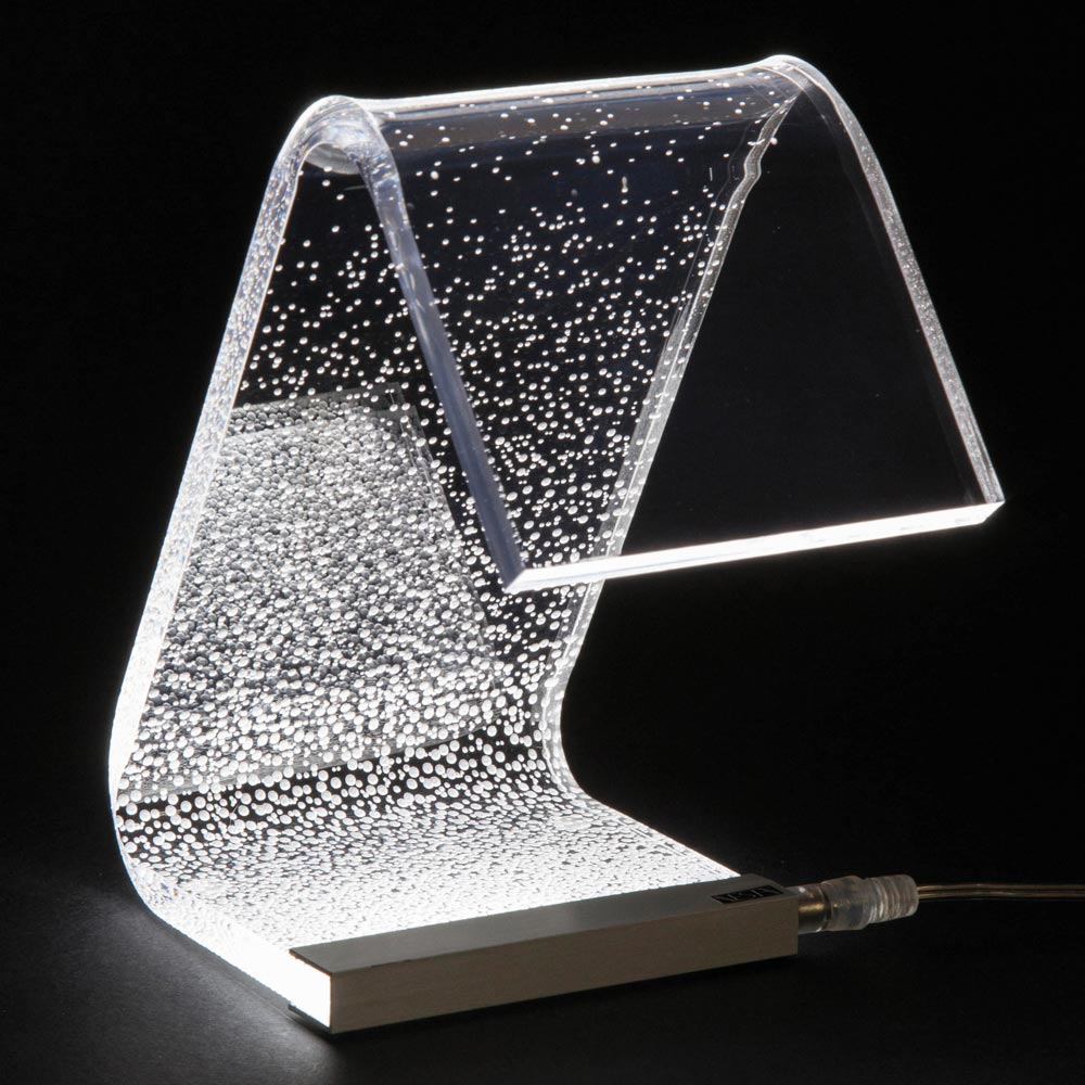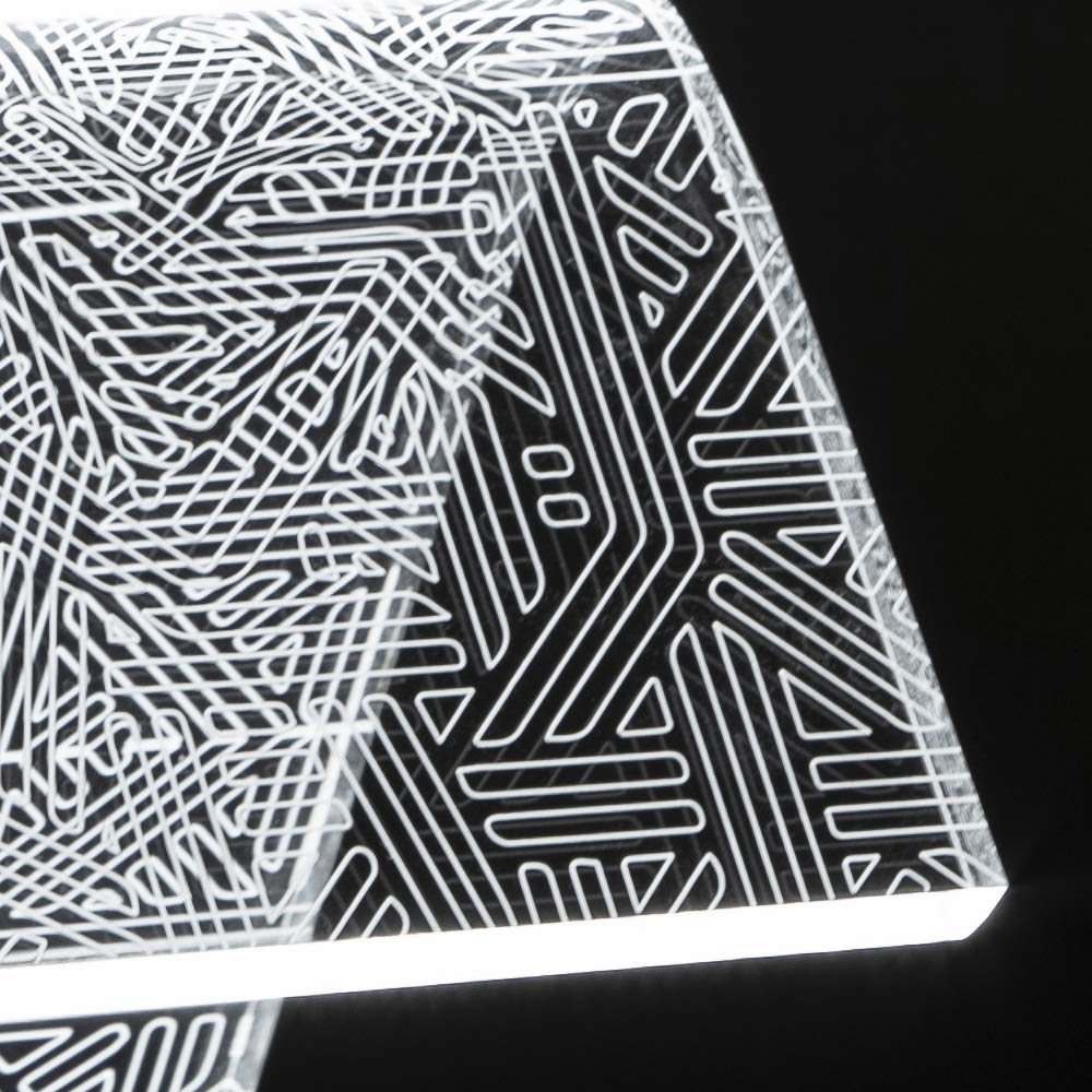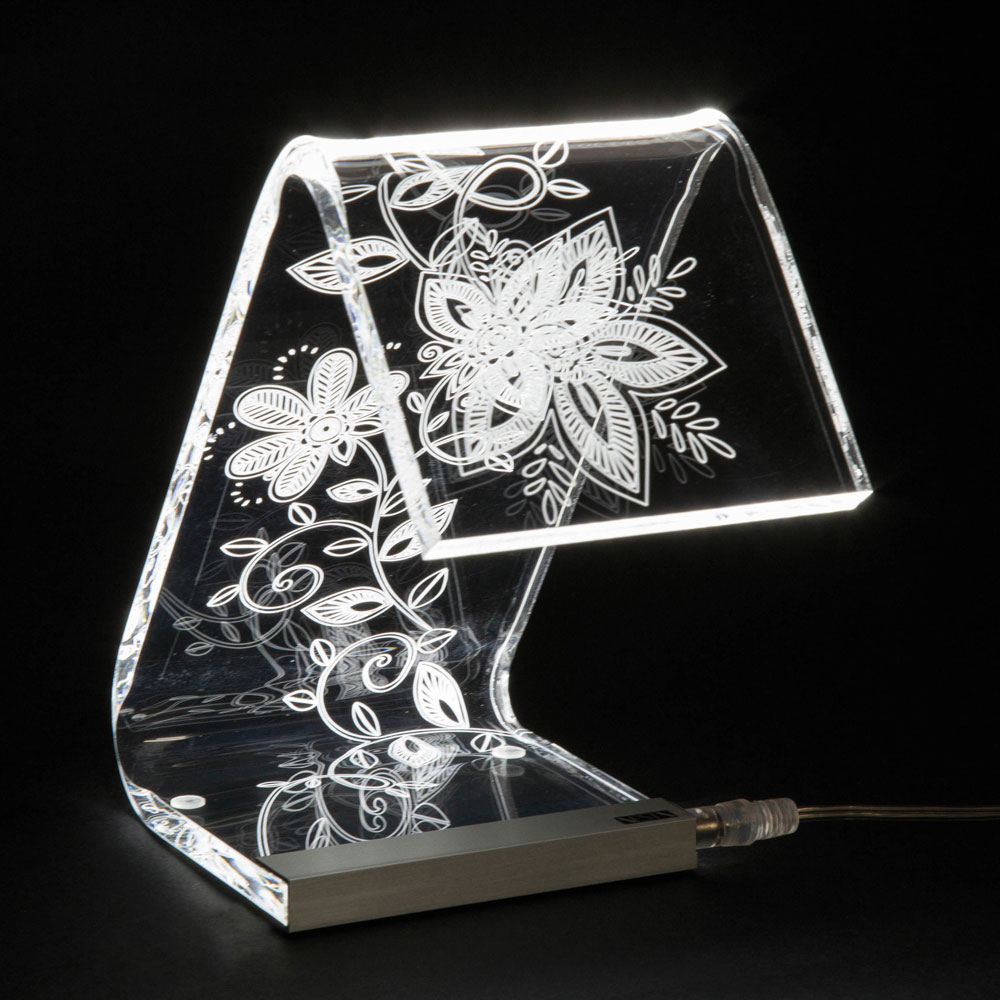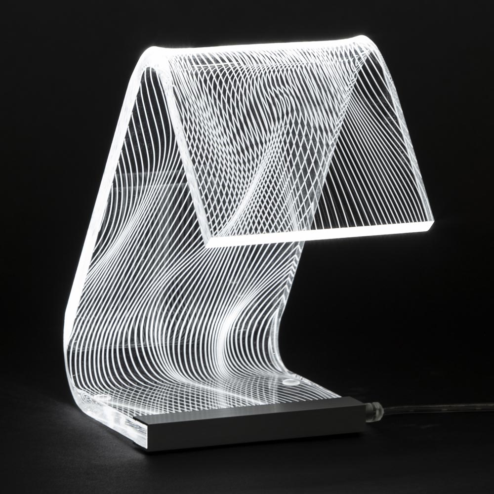 This table lamp   it is entirely made of transparent and hand-bent acrylic crystal with a thickness of 10 mm and is characterized by laser engravings on the surface which, through a LED strip placed at the base, light up along the entire length of the light body, creating an extraordinary play of effect made possible thanks to the physical-technical characteristics of the acrylic crystal.