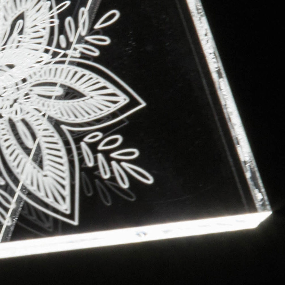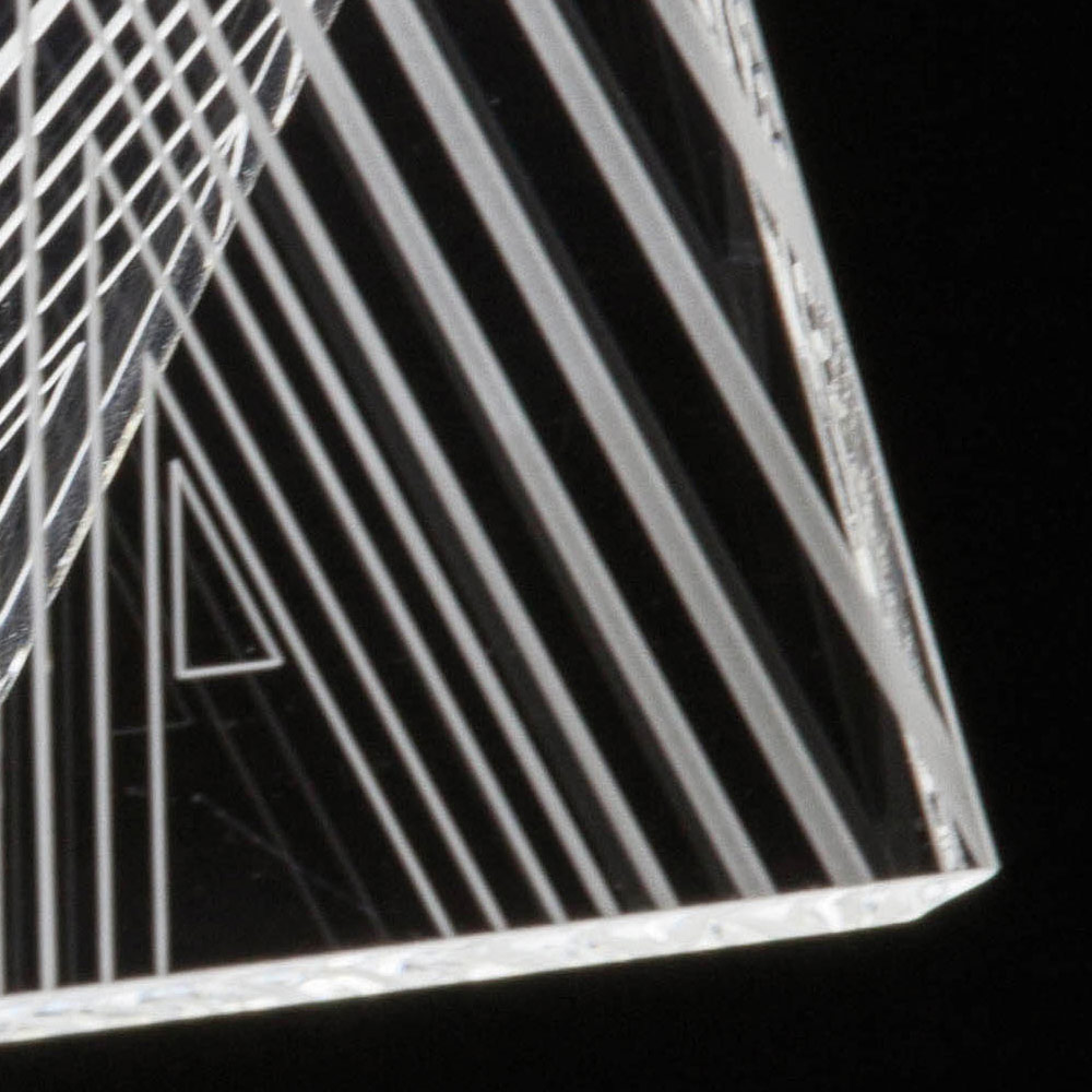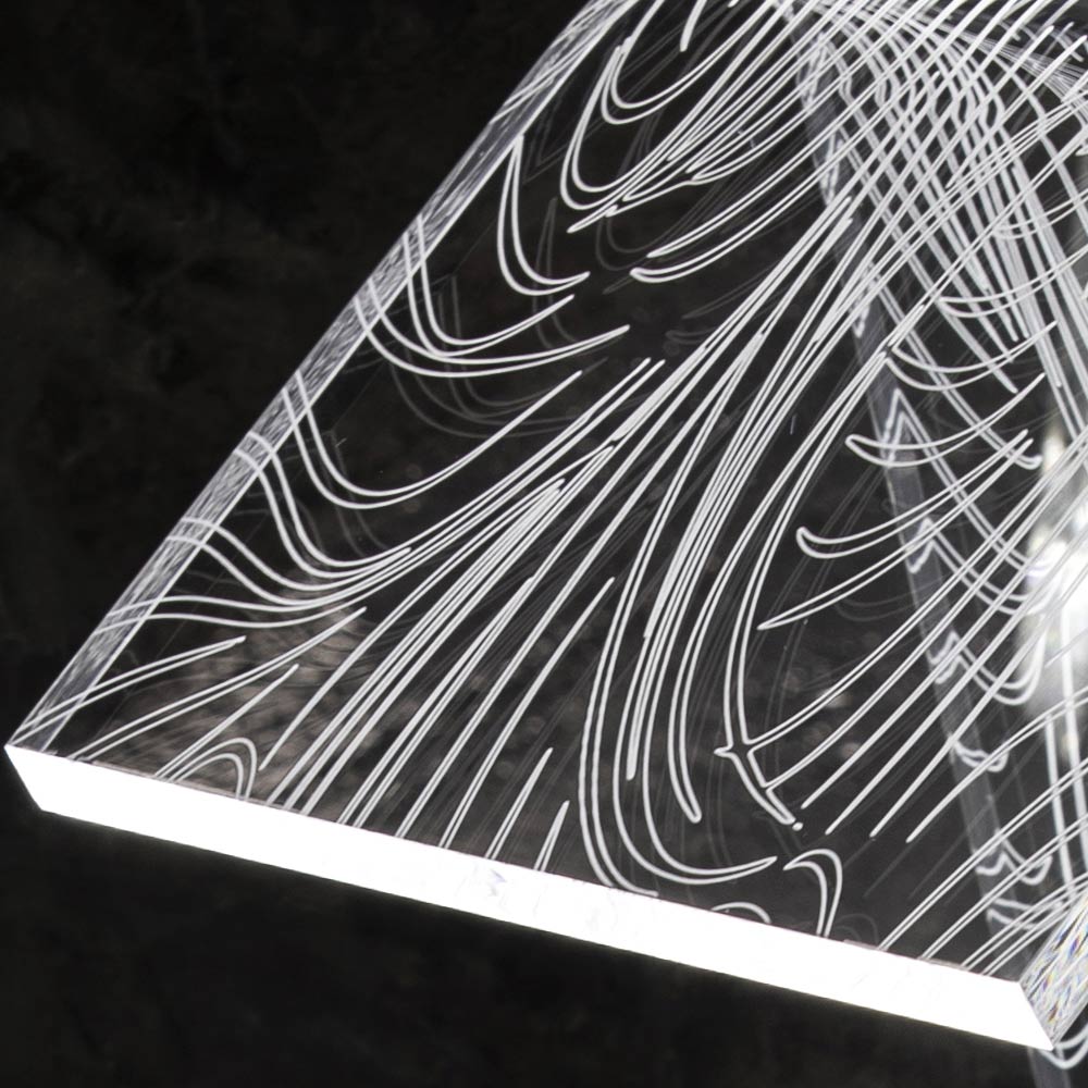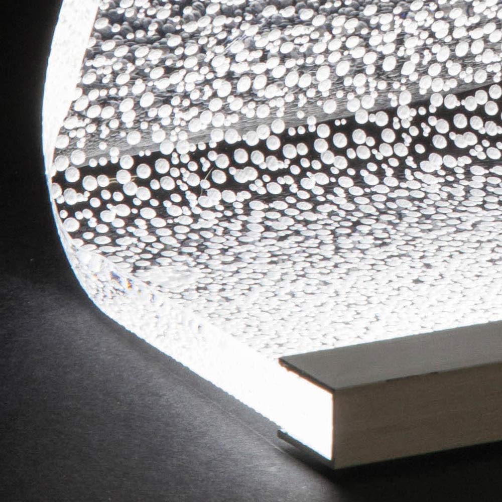 This table lamp   it is entirely made of transparent and hand-bent acrylic crystal with a thickness of 10 mm and is characterized by laser engravings on the surface which, through a LED strip placed at the base, light up along the entire length of the light body, creating an extraordinary play of effect made possible thanks to the physical-technical characteristics of the acrylic crystal.