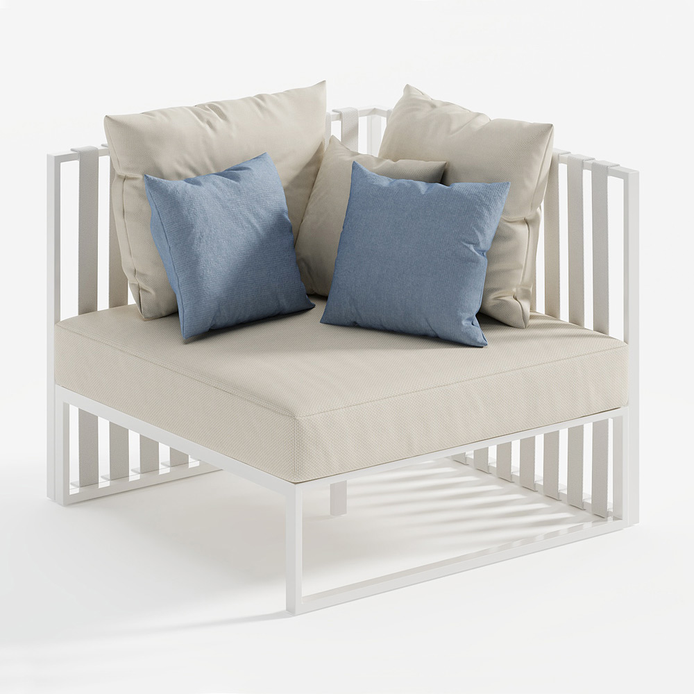 Garden sofa with left corner structure in epoxy powder coated aluminum (with shockproof and scratchproof characteristics) and polyester belts with upholstered seat in Irisun® Living Solids fabric entirely Made in Italy . The feature that makes this product unique is the alternation of solids and voids that lightens the structure making it float in space. This furnishing set is perfect for giving the room a unique and sophisticated touch and, thanks to the materials used, quality and resistance over time is guaranteed. The comfort of the seat allows you to create a welcoming and informal atmosphere suitable for all occasions.