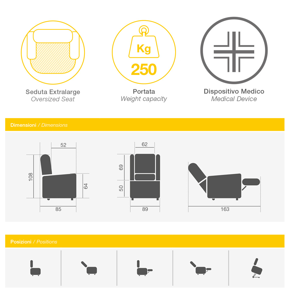 Thanks to the lift and relax technology it is possible to accompany the movements when sitting and getting up. The practical remote control allows you to adjust the backrest and footrest (movement independent of each other) according to your comfort needs.