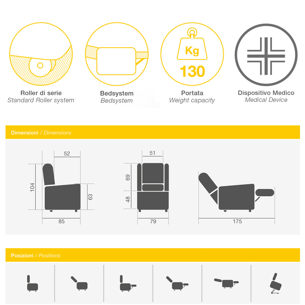 Armchair made with iron and wood structure, padding in non-deformable polyurethane foam with differentiated densities , 2-motor mechanics with Lift/Relax/Bed functions and quality fabric with high resistance to wear and rollers as standard.