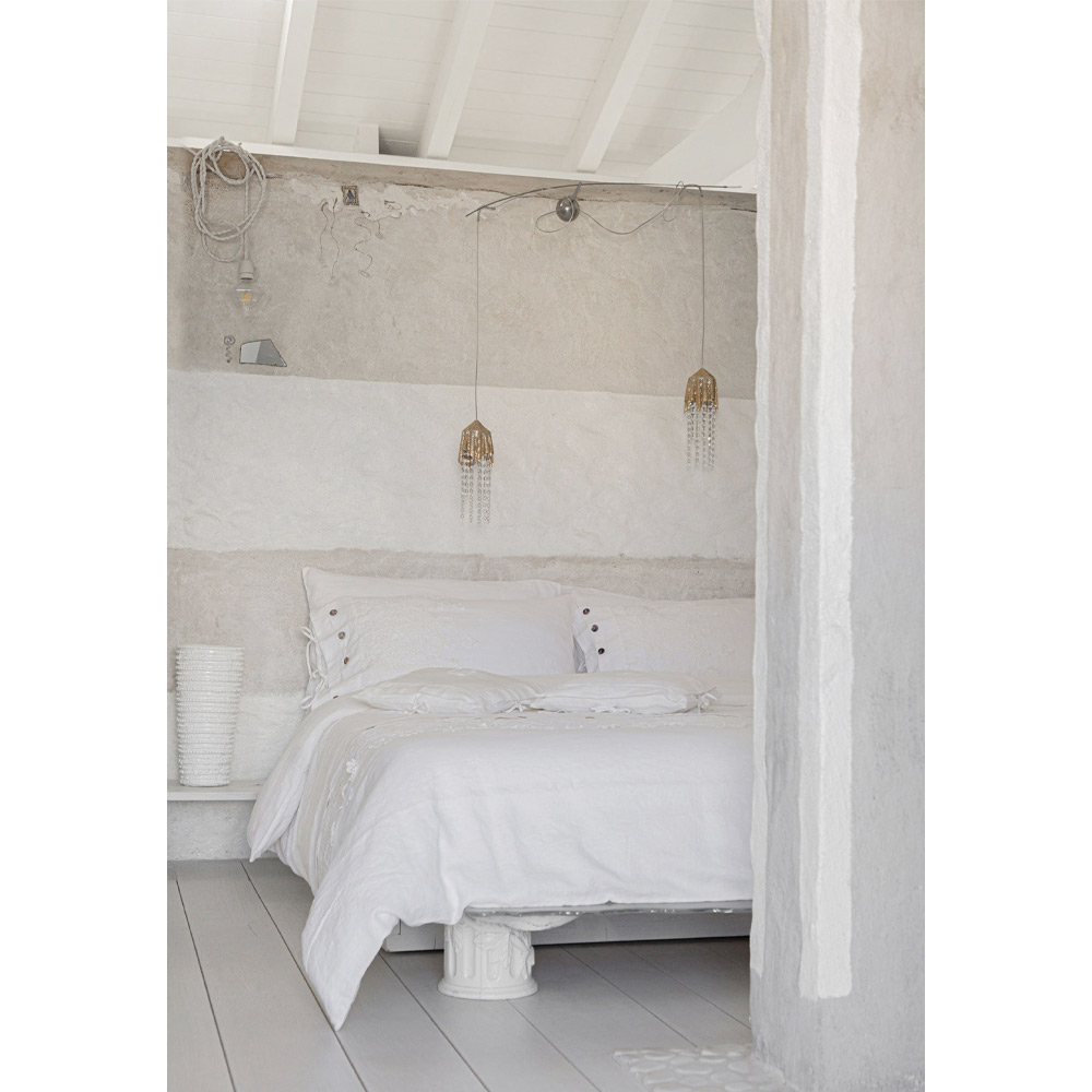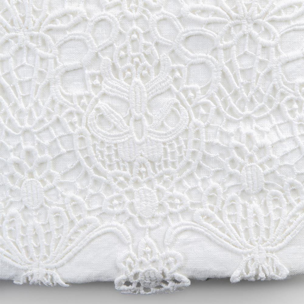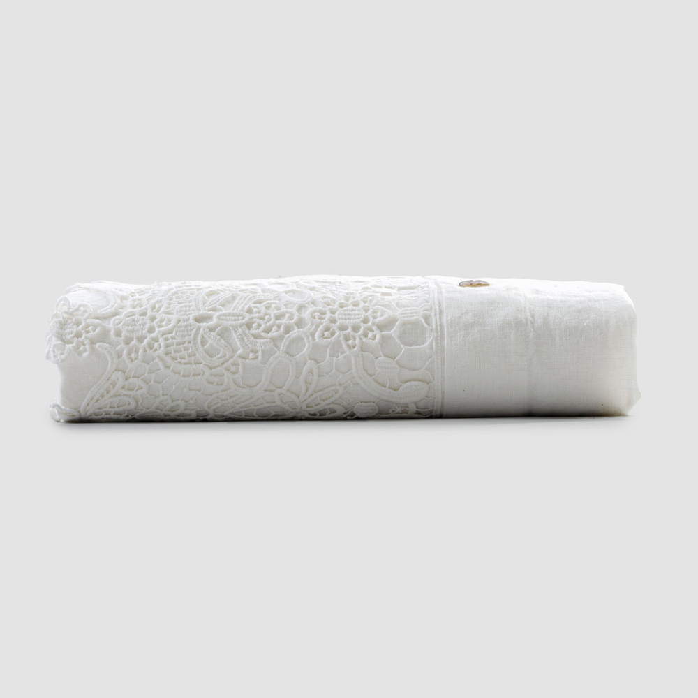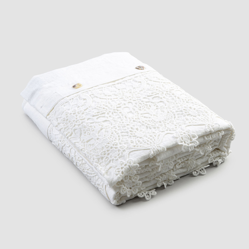 Double duvet cover in white linen with lace drops, handcrafted luxury design made in Italy.