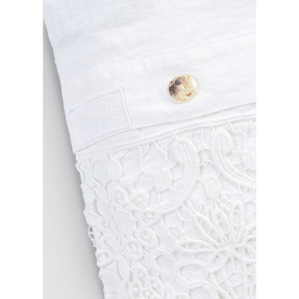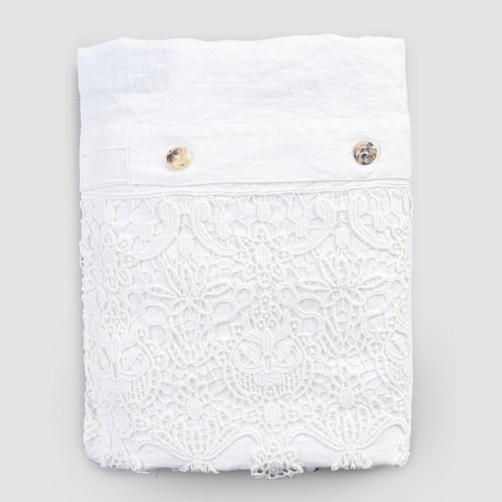 The value of tradition joins the modern lifestyle with this heavy white linen container sack embellished with drop lace and Agoya mother-of-pearl buttons.