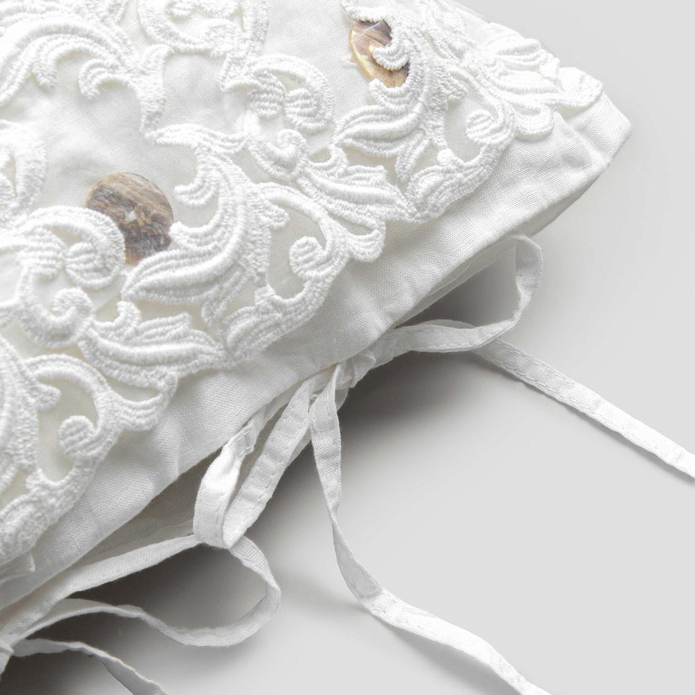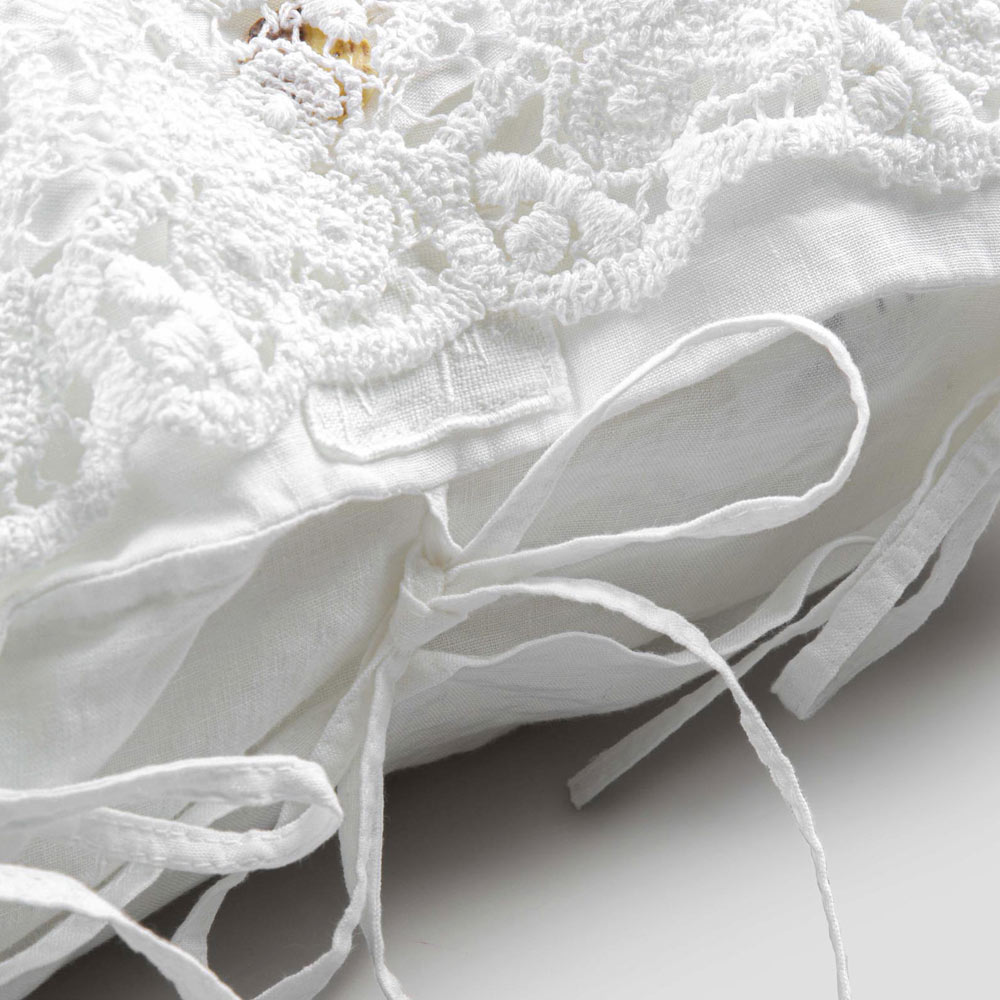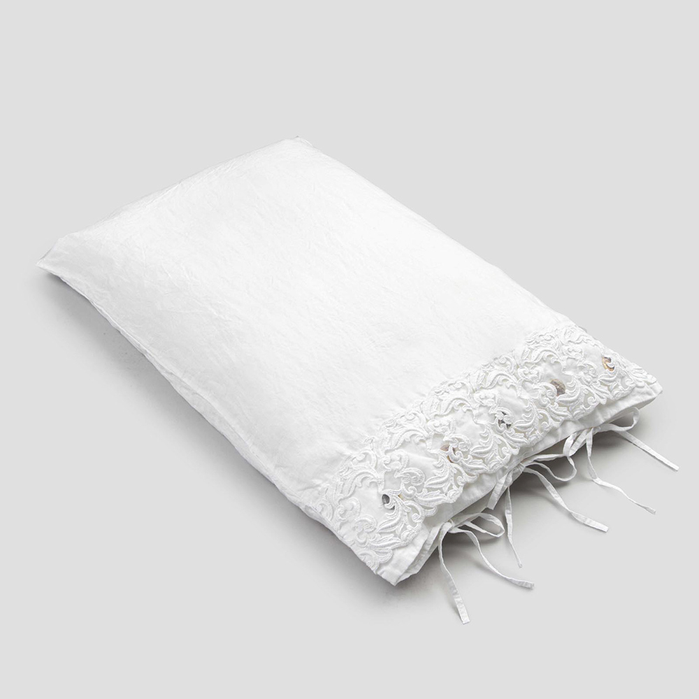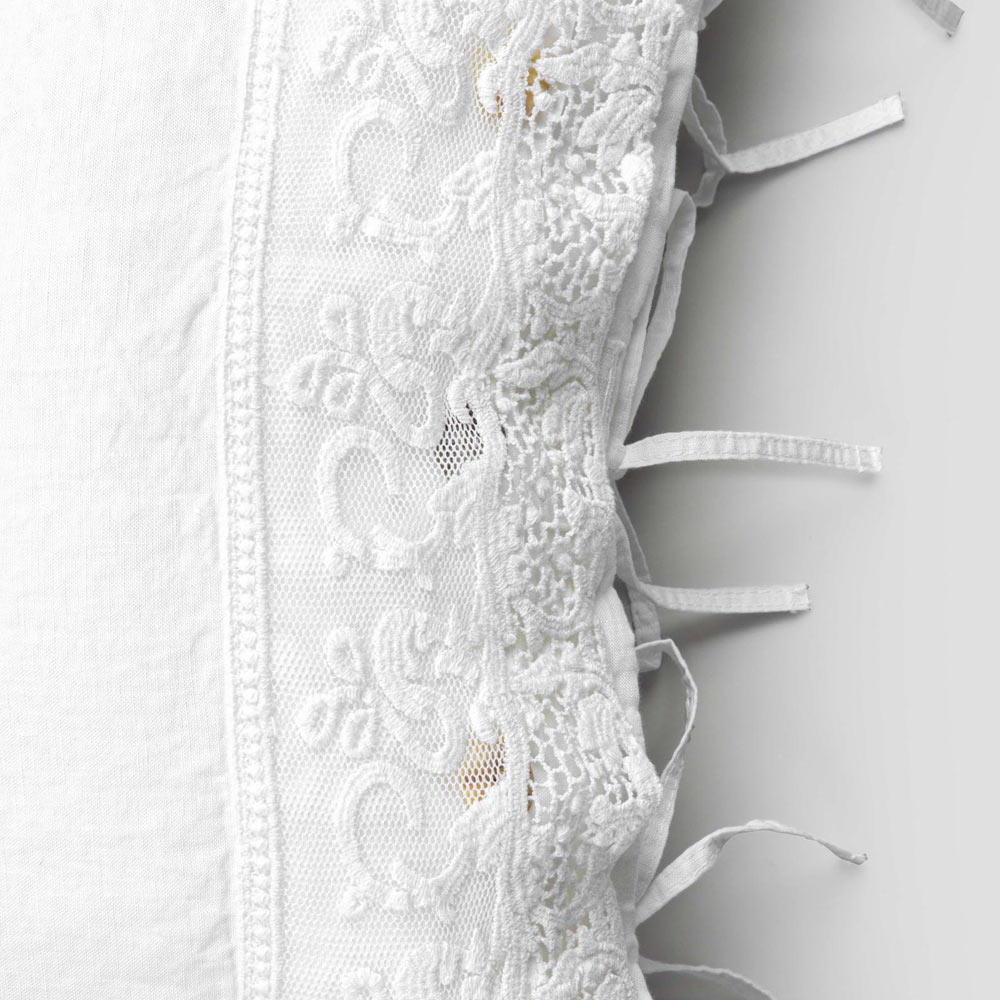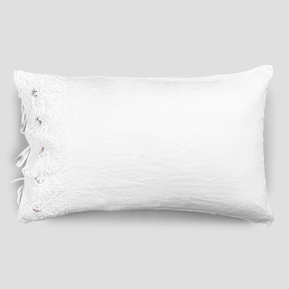 The value of tradition is combined with the modern lifestyle in this white linen pillowcase embellished with tulle or farnese or crochet lace sewn on to the decorative flap, mother-of-pearl Agoya buttons and laces closure.