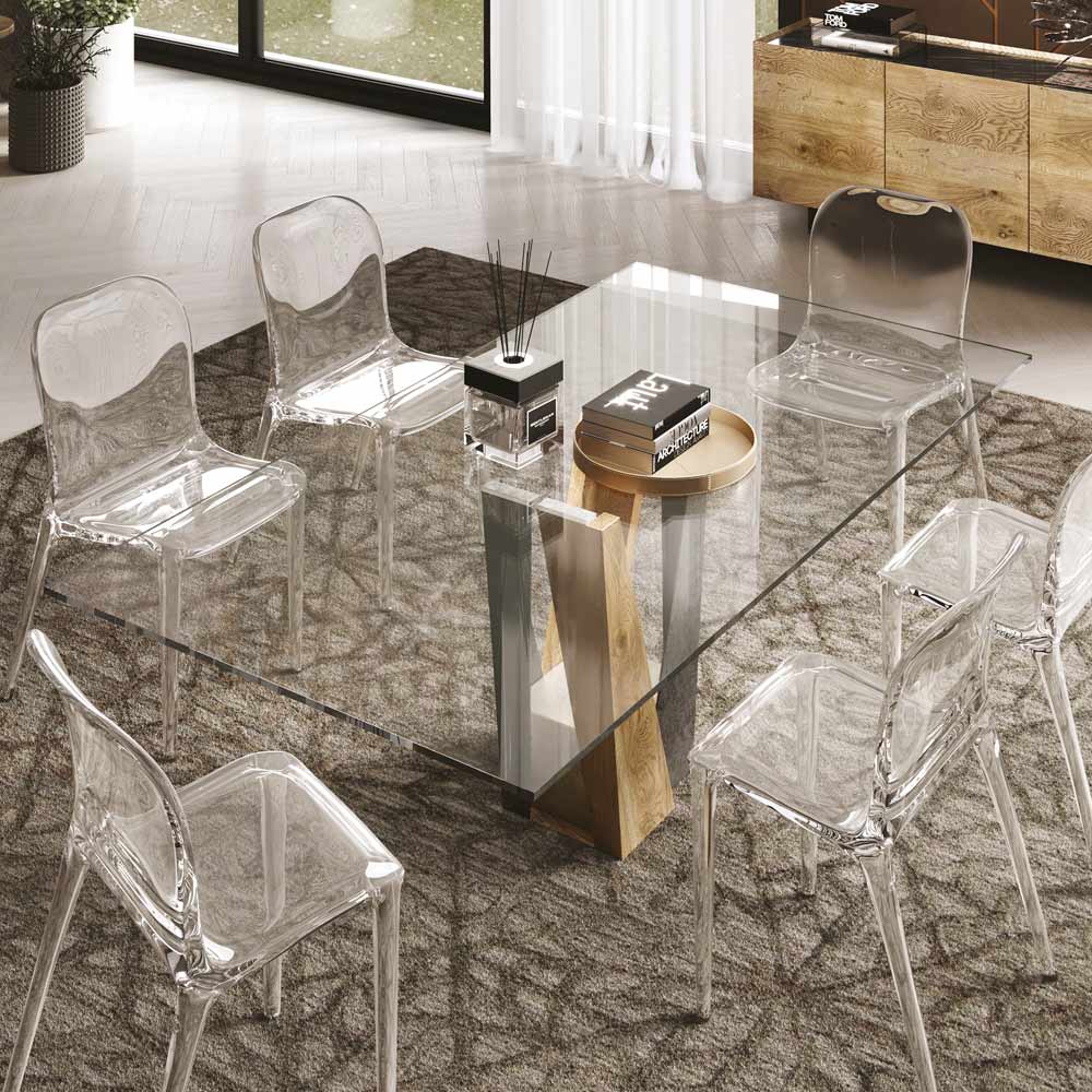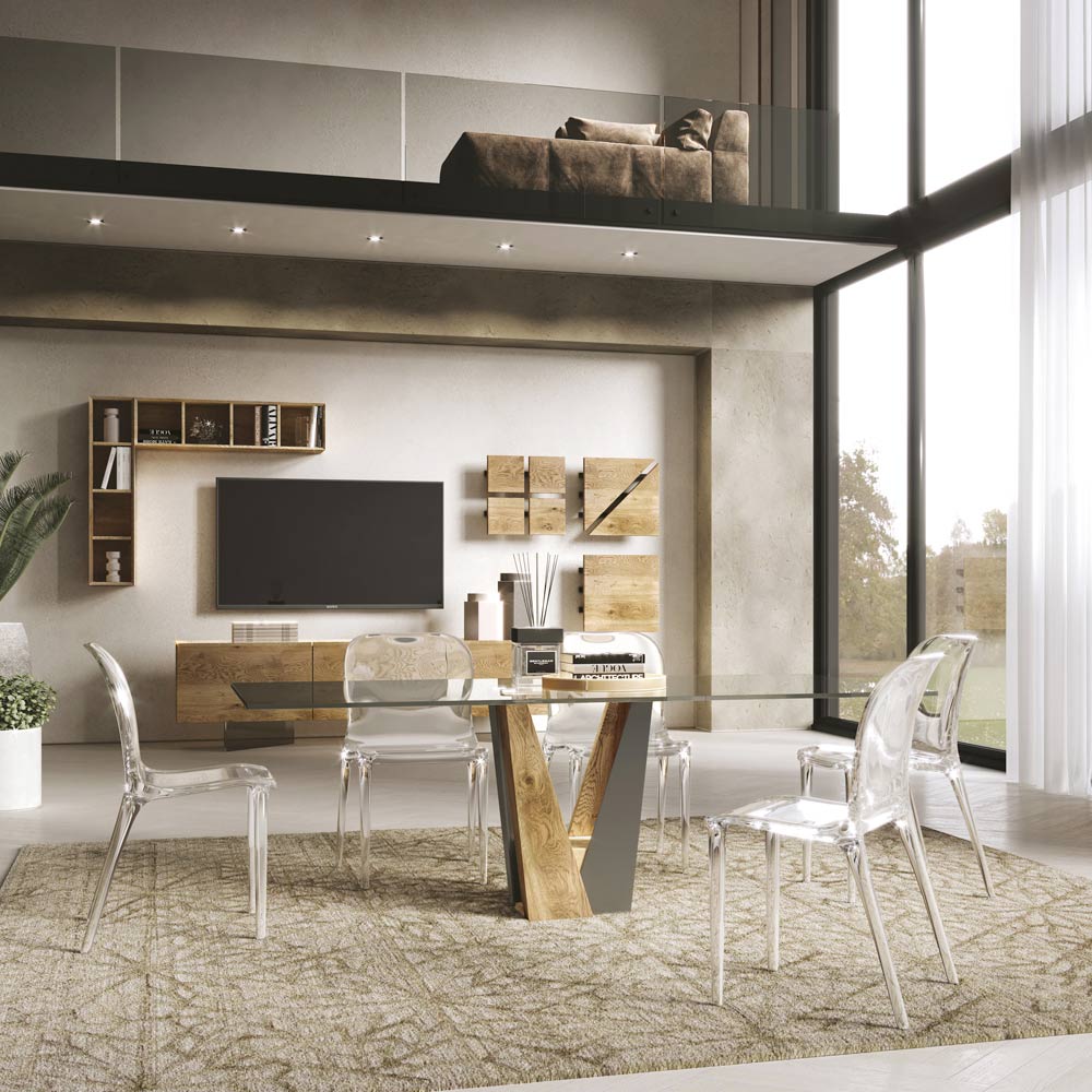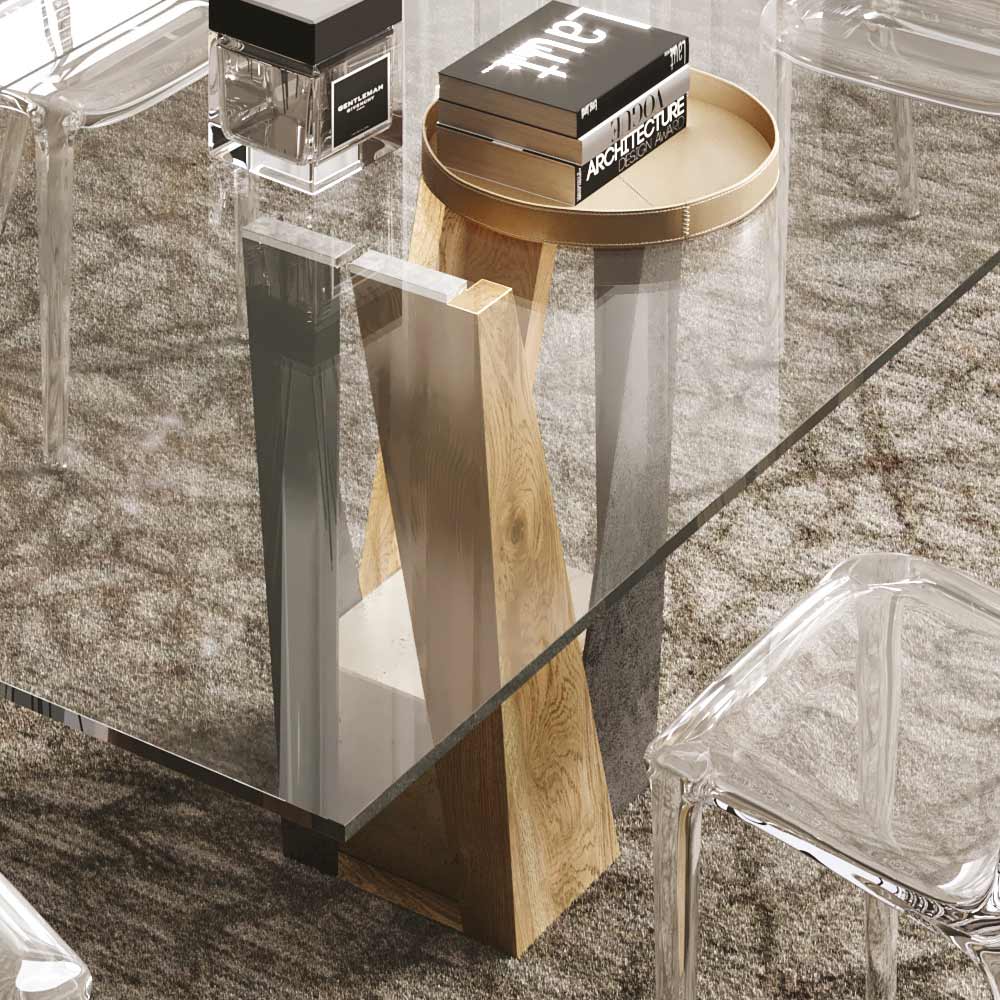 Living room glass table with wooden base and matt black metal Made in Italy.