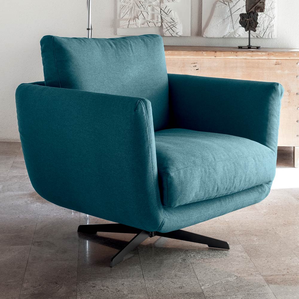 anthracite-coloured painted metal. The armchair represents a harmonious fusion of comfort and modern style. The elegant design with soft and rounded lines evokes a feeling of coziness, while the sturdy structure ensures durability over time. The high-quality fabric upholstery, together with the large and comfortable cushions, promises a relaxing seating experience. The thin and geometric feet add a sophisticated touch, making the armchair a fascinating piece of design. This armchair is ideal for those looking for a furnishing solution that combines modern aesthetics and impeccable comfort.