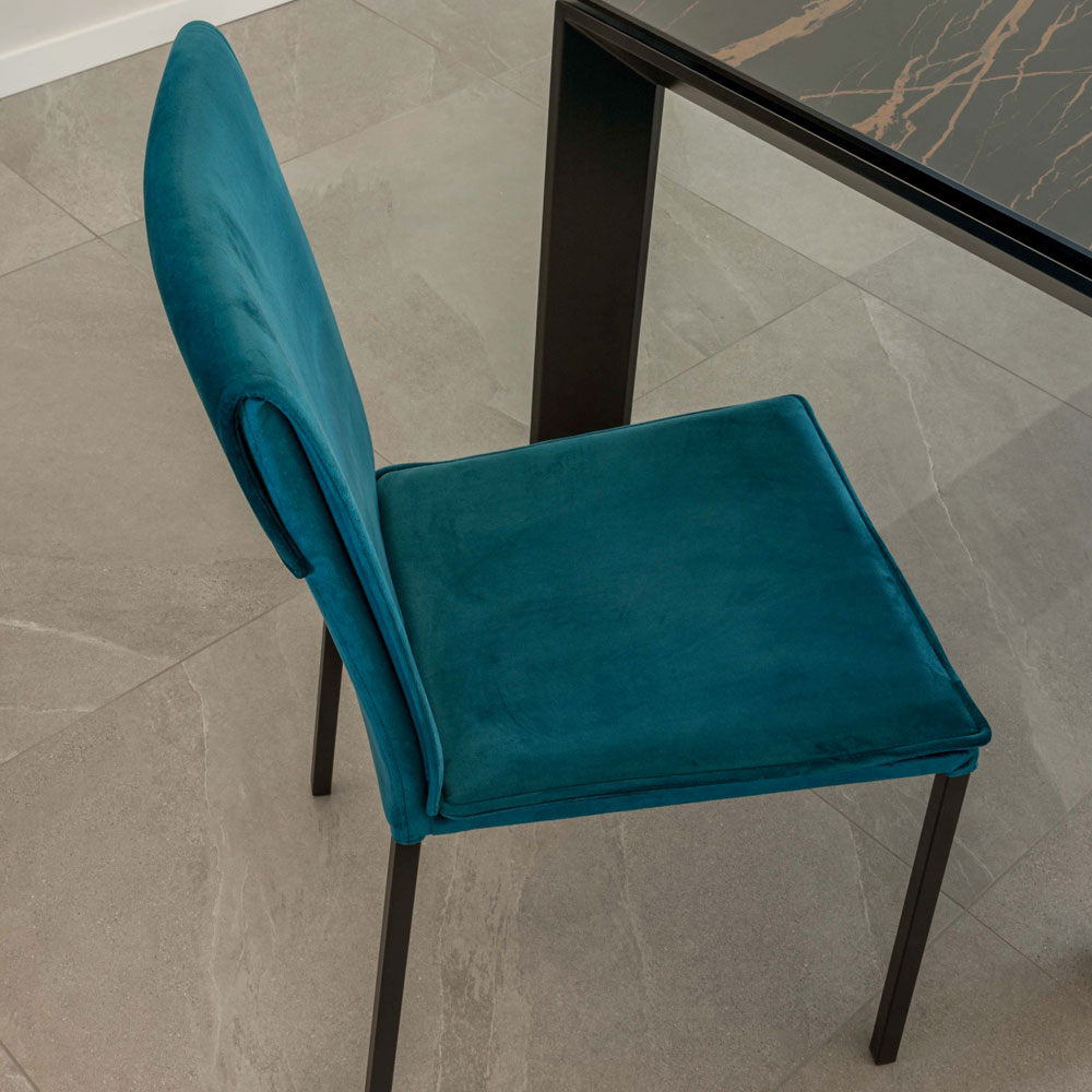 Indoor chair made with stain-resistant velvet seat and black painted metal structure.