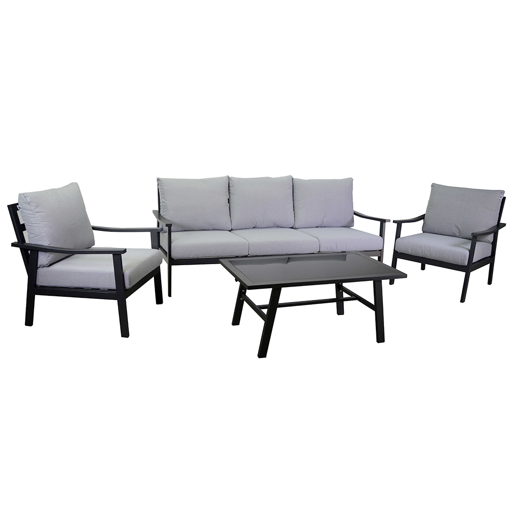 The ensemble is completed by a glass-topped center table , perfect for holding drinks and snacks, making this set the centerpiece of any outdoor social gathering. The minimalist and contemporary design of the lounge will blend seamlessly into any outdoor space, adding a touch of modern style .