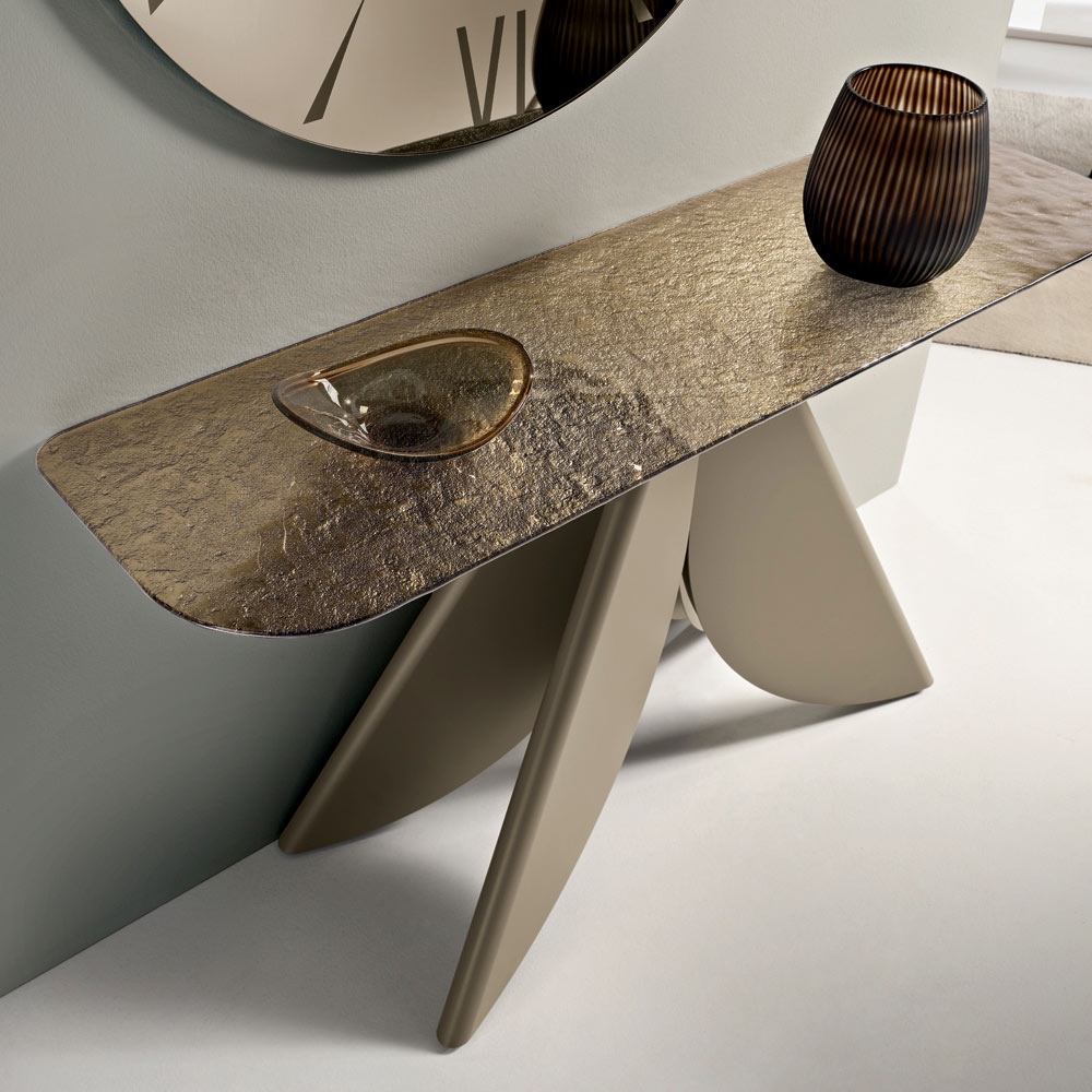 The back-silvered hammered glass top adds brightness and visual depth thanks to its material texture that reflects light with iridescent effects, making the surface elegant and distinctive.