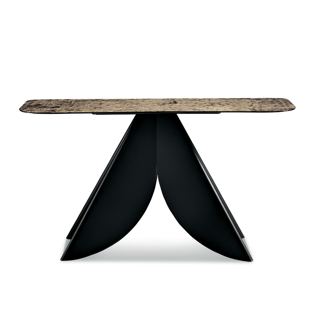 The structure is characterised by a painted metal base composed of four intertwined curved elements that recall the shape of petals, creating a refined, dynamic and scenographic graphic effect.