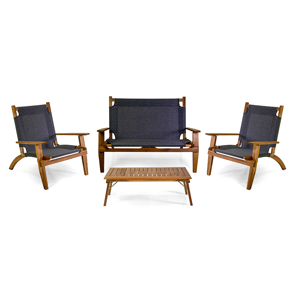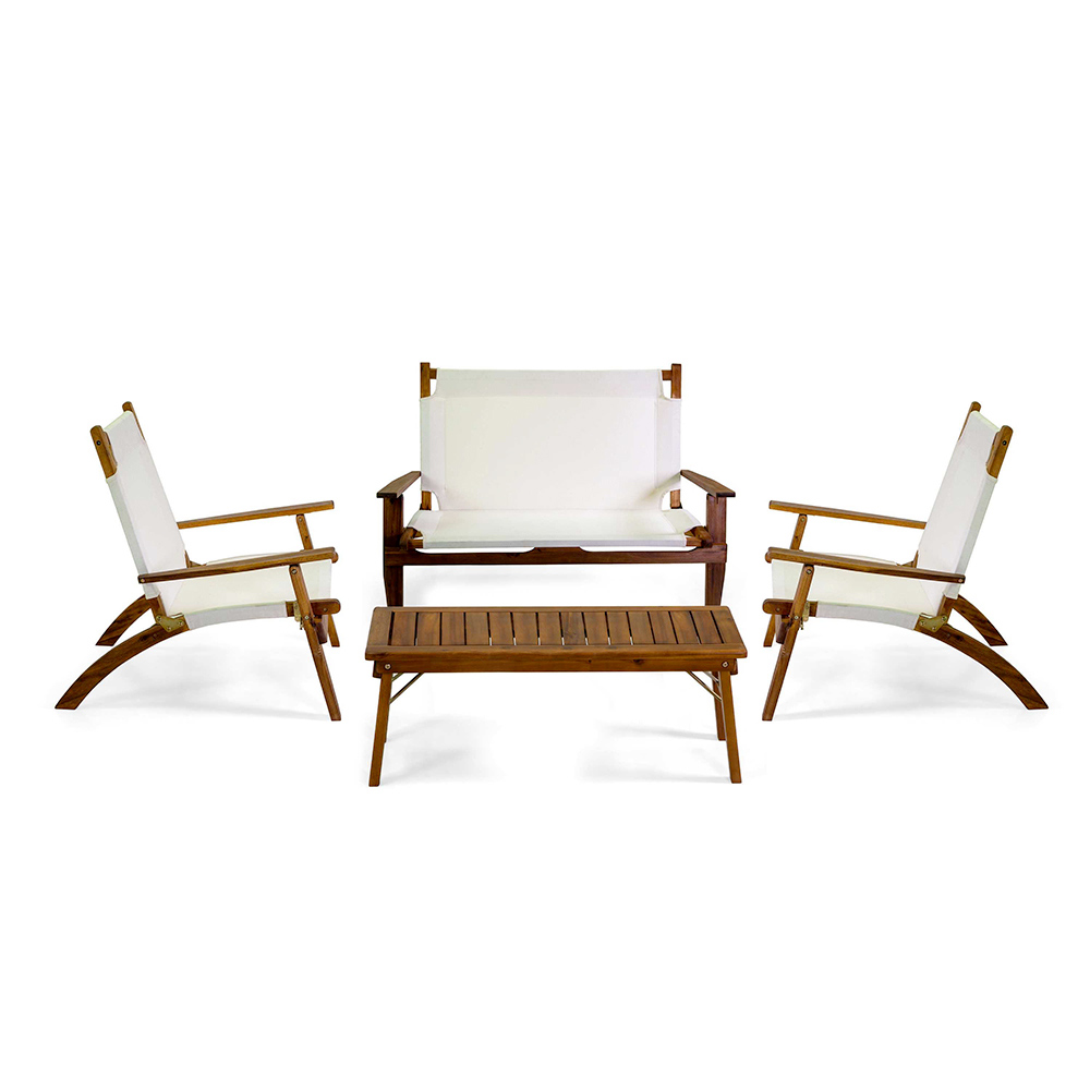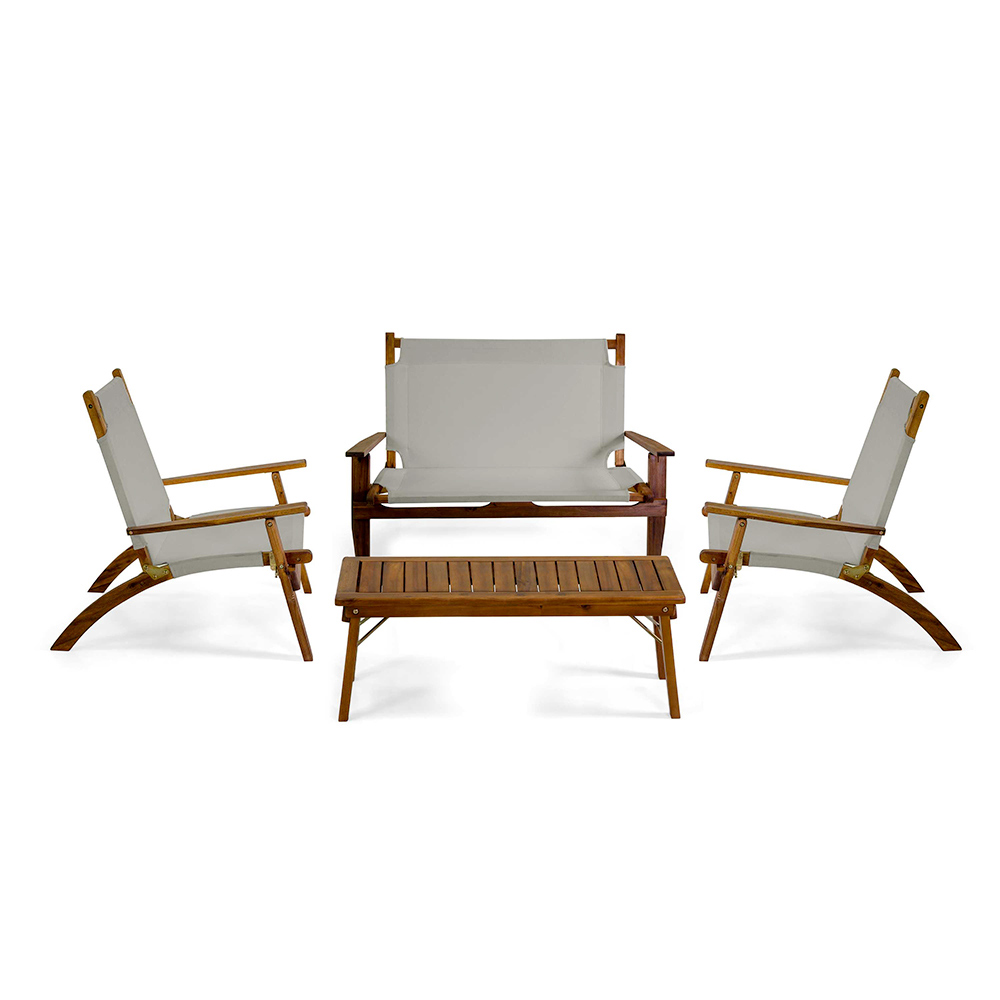 This elegantly designed wooden lounge set is ideal for those seeking comfort and style in one product. Perfect for relaxing outdoors, this set includes two armchairs , a sofa and a coffee table , all featuring a sturdy curved wood frame and durable fabric details. The clean lines and clever use of materials make it the ideal choice for any outdoor space , from the garden to the terrace, offering a corner of pure relaxation where you can enjoy moments of peace or welcome friends and family. The inviting seats ensure maximum comfort, making it the perfect place for any outdoor relaxation occasion.