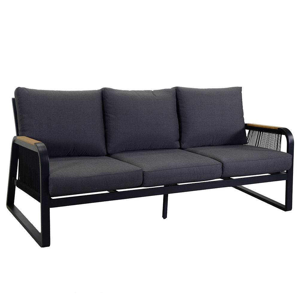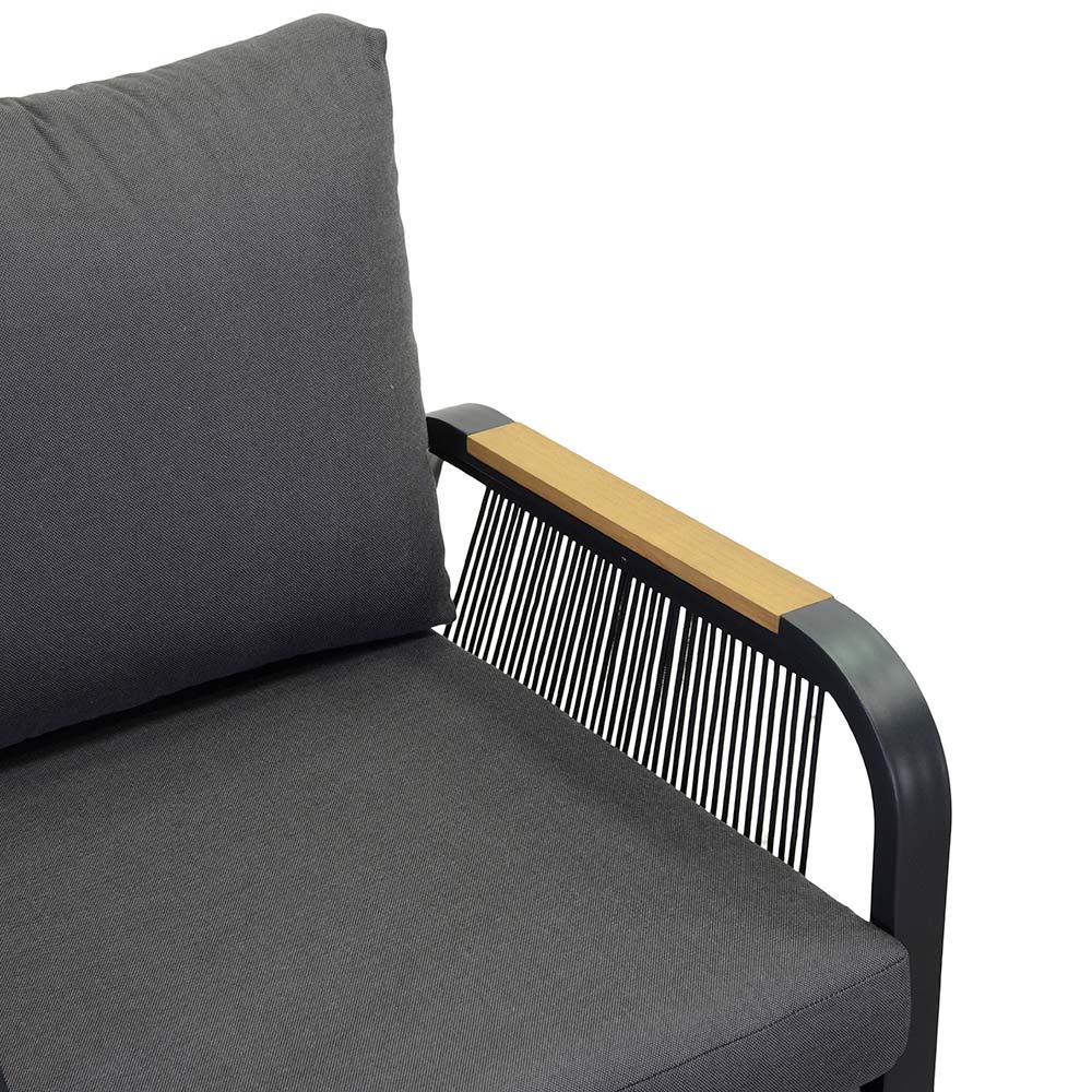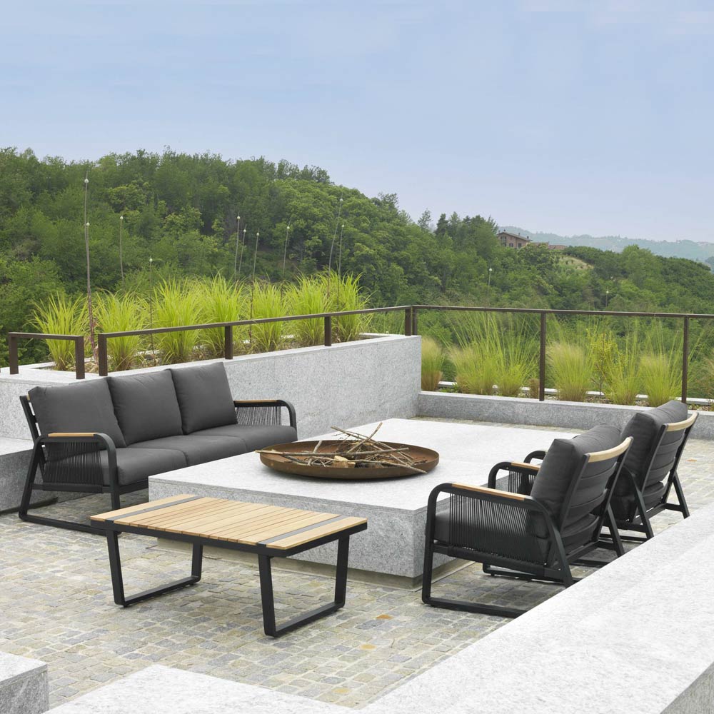 1 sofa: frame in anti-rust powder-coated aluminium in anthracite colour, woven polyester ropes in anthracite colour, water-repellent cushions in dark grey polyester, removable covers and armrests in TEAK wood from Brazil