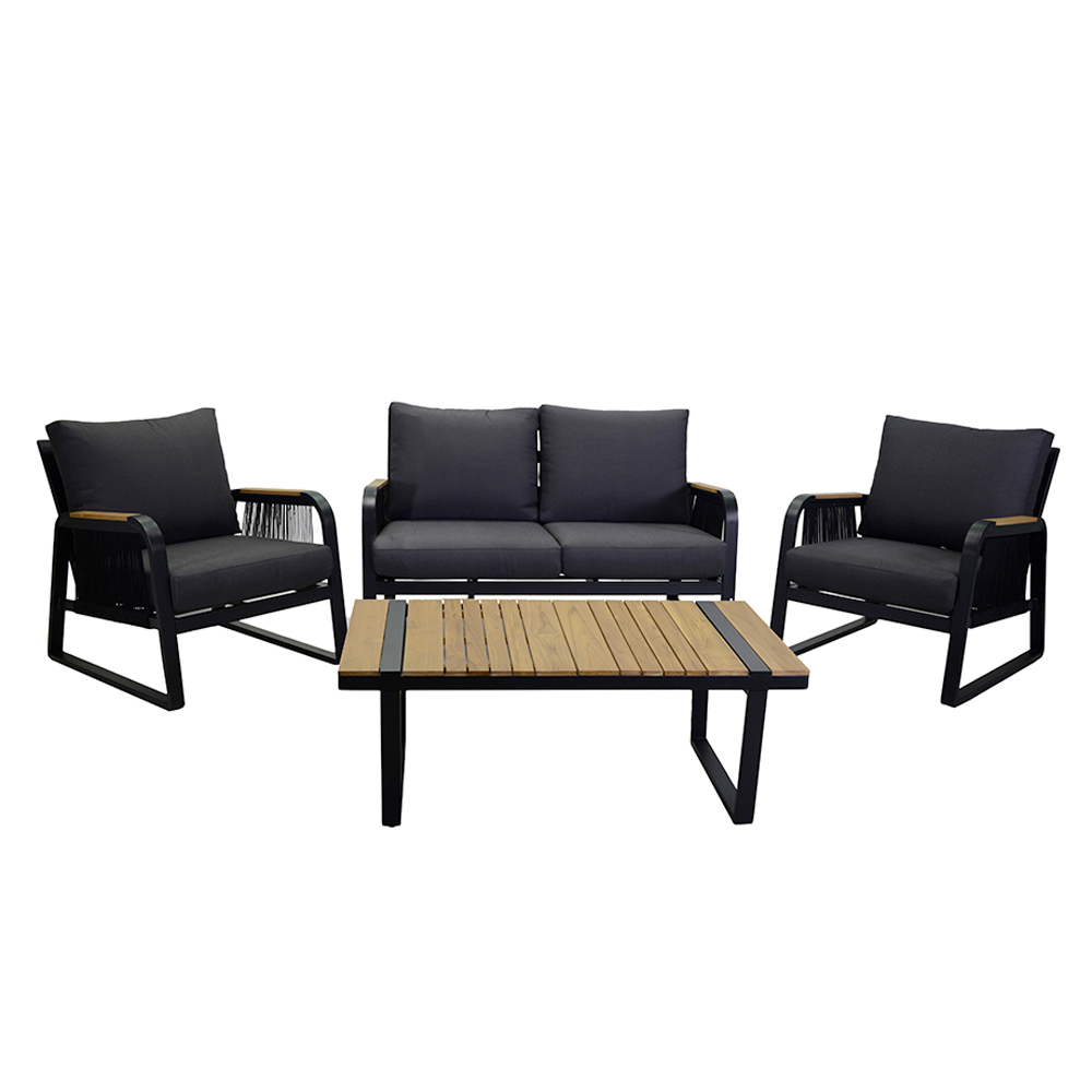 Experience modern luxury and comfort with this outdoor lounge set , ideal for enhancing any outdoor space thanks to its sturdy powder-coated aluminum frame . The set includes a sofa, two single armchairs and a matching coffee table with an elegant wooden top , perfect for holding drinks and decorations.