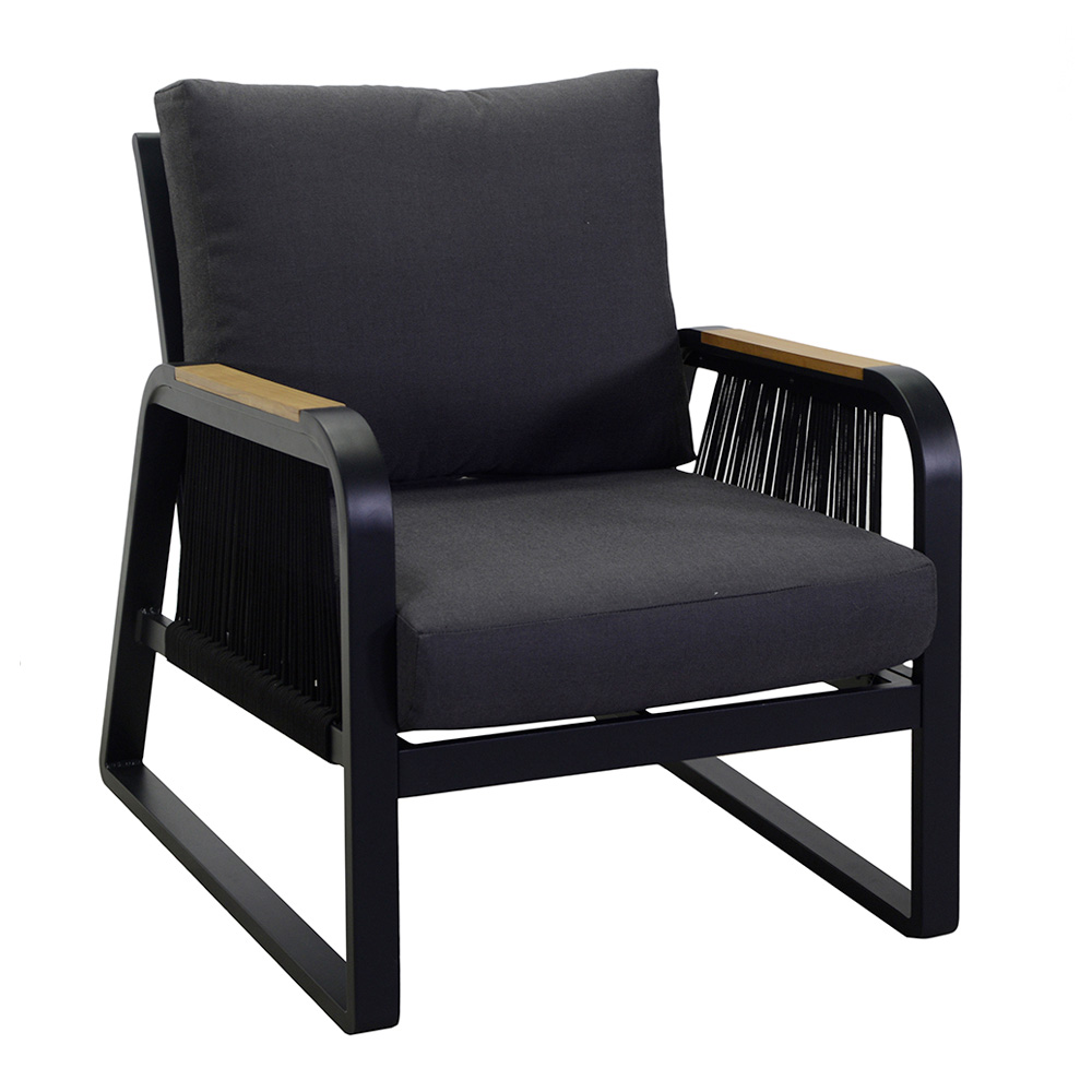 2 armchairs: frame in rustproof powder-coated aluminium in anthracite, ropes in woven polyester in anthracite, water-repellent cushions in dark grey polyester, removable covers and armrests in TEAK wood from Brazil