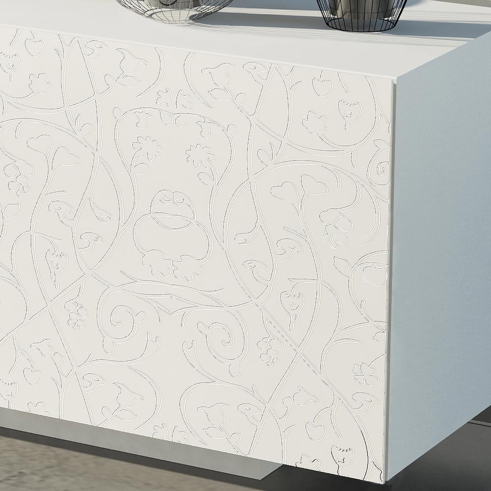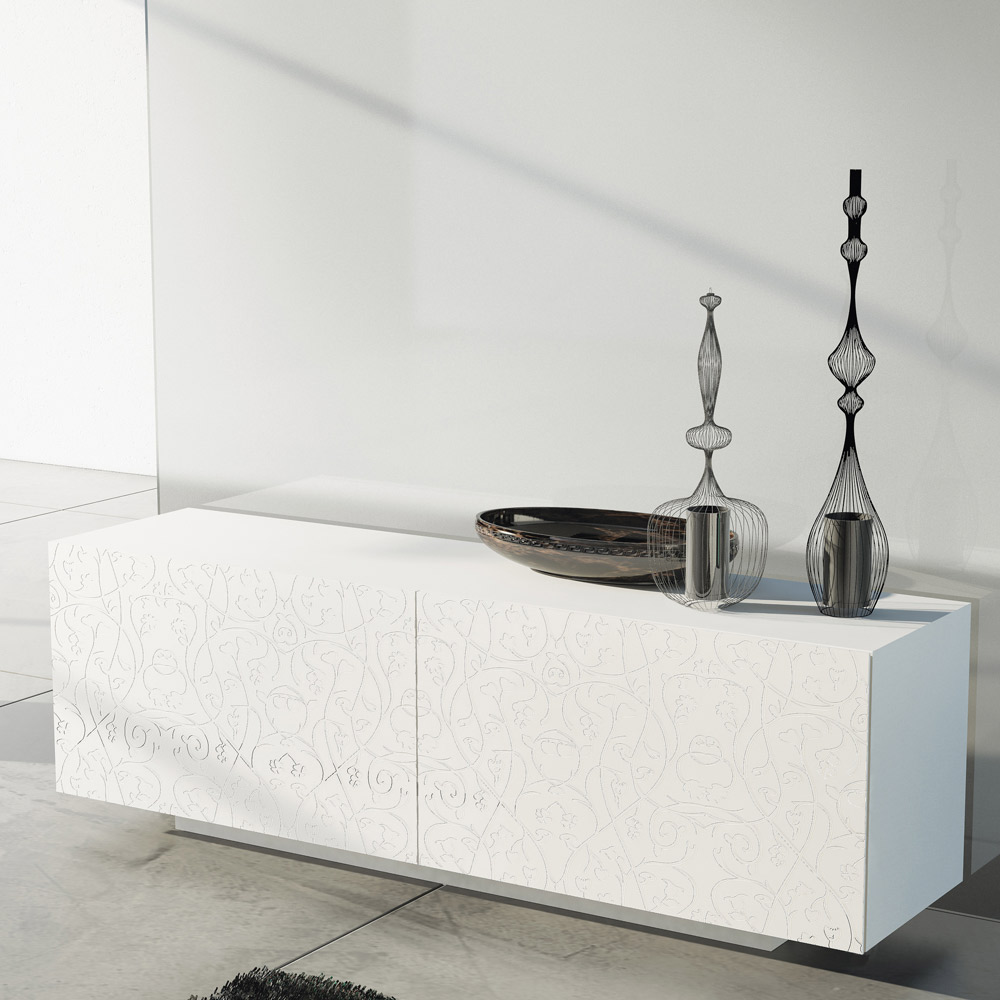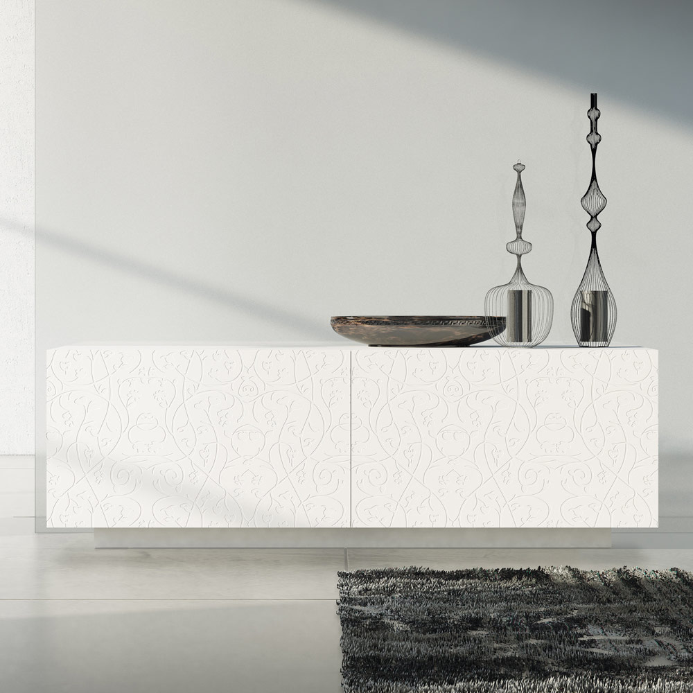 Modern sideboard with white matt lacquered MDF structure composed of 2 coplanar sliding doors   which guarantee great functionality and practicality and from the lacquered plinth which offers a lot of stability. This product is full of taste and design thanks to its elegant and refined finishes and the bas-relief decoration of the doors which makes them unique in their kind.   The various materials used for the construction offer great quality and resistance over time, giving the product that unique and unforgettable touch.