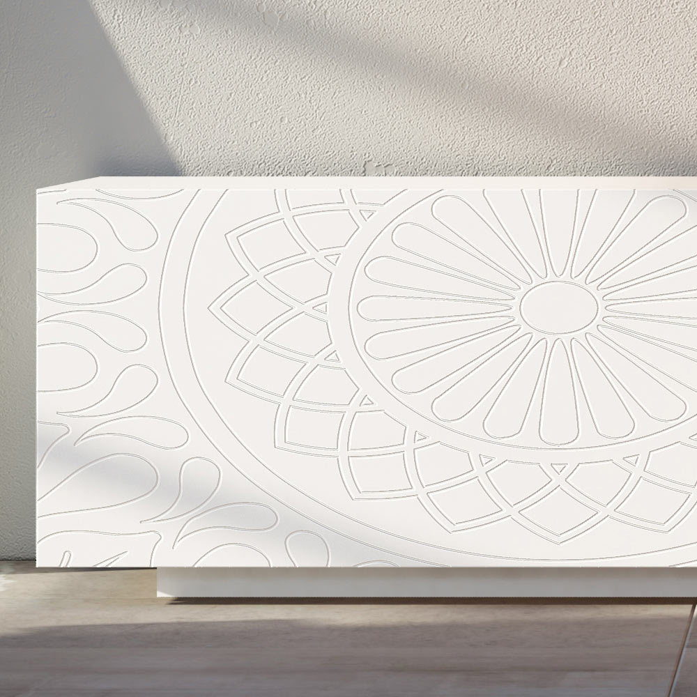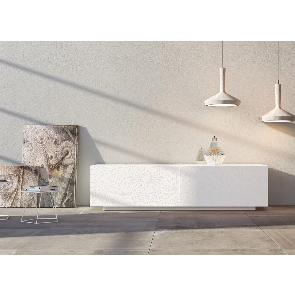 Modern sideboard with white matt lacquered MDF structure composed of 2 coplanar sliding doors   which guarantee great functionality and practicality and from the lacquered plinth which offers a lot of stability. This product is full of taste and design thanks to its elegant and refined finishes and the bas-relief decoration of the doors which makes them unique in their kind.   The various materials used for the construction offer great quality and resistance over time, giving the product that unique and unforgettable touch.