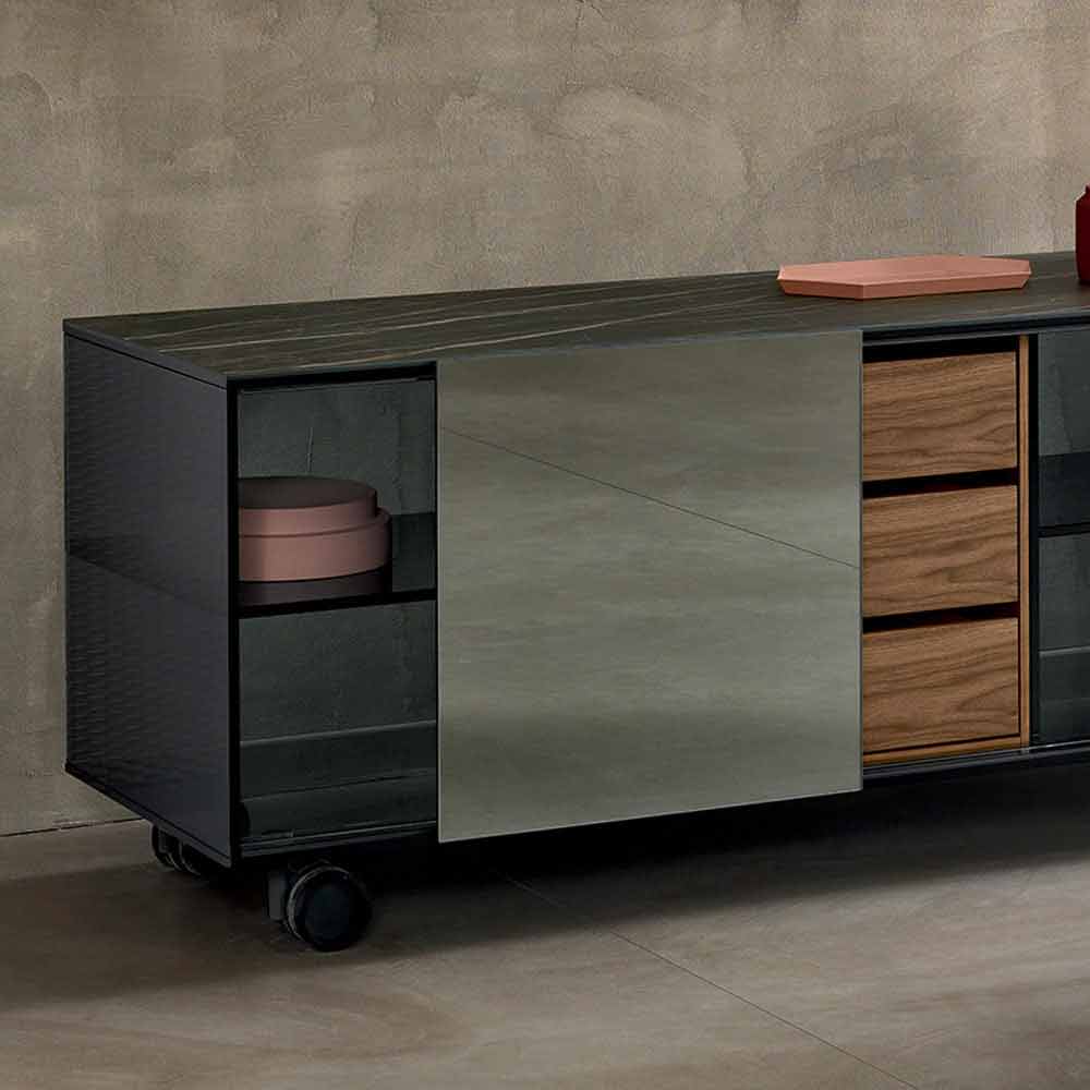 Modern style living room sideboard on wheels with a smokey glass structure and a Noir Desir ceramic top, realized by hand in Italy.