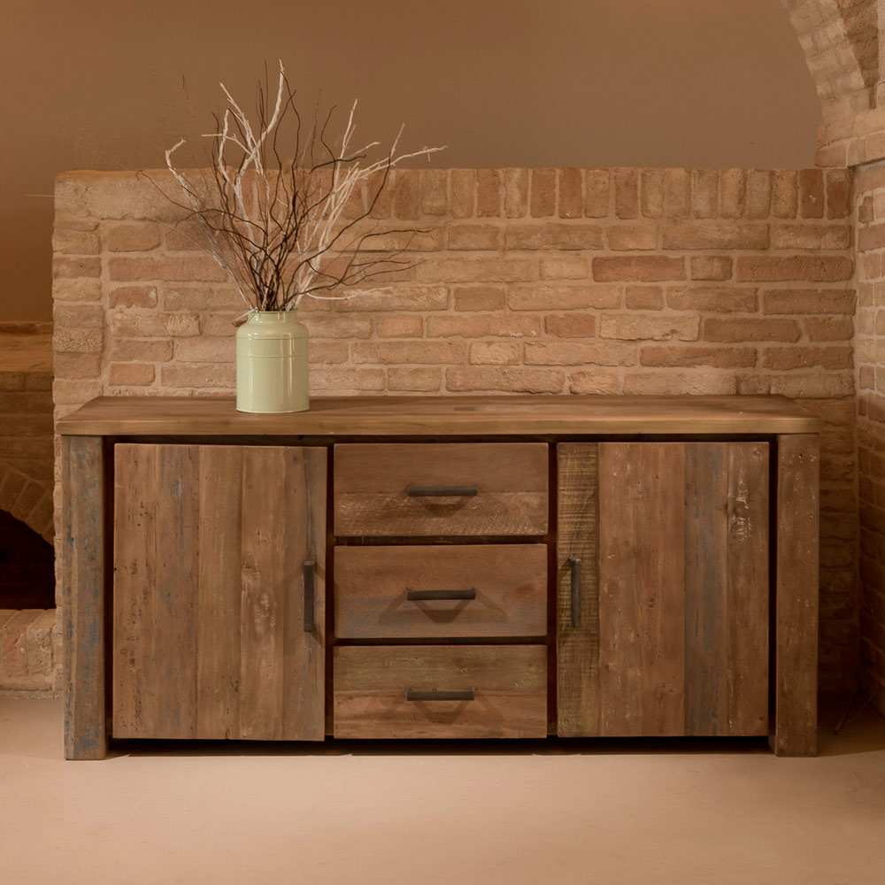 Indoor sideboard made of recycled wood with Pandora finish with 2 doors and 3 center drawers.