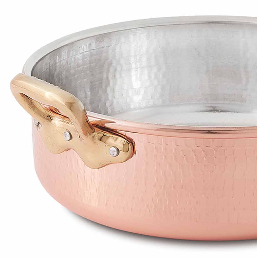 Low casserole in hand-hammered copper with brass handles, round 24 cm made in Italy.