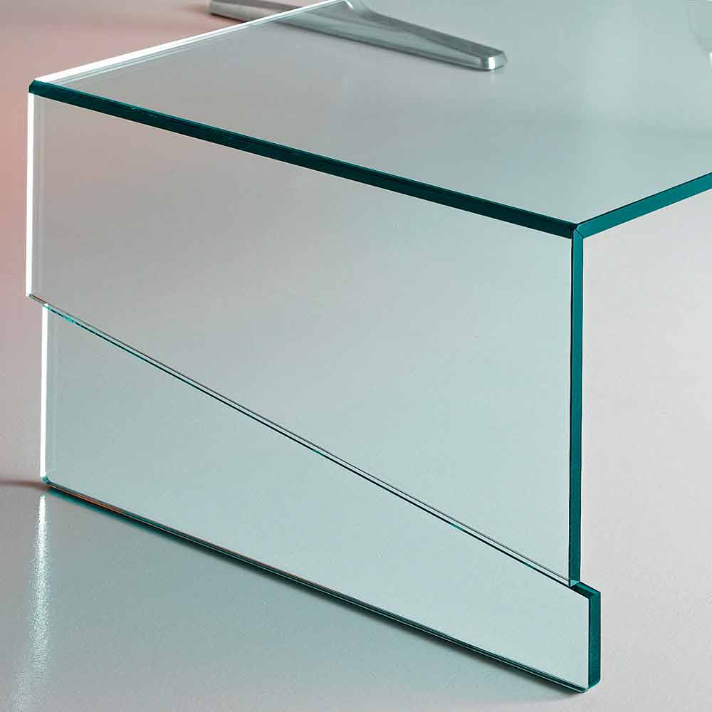 Entirely made of transparent glass , it is characterized by the cantilevered cut and welded side and support surfaces made using a technology that is positioned at the service of design.
