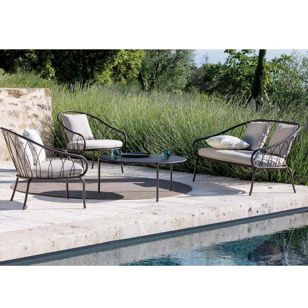 Outdoor armchair made with powder-coated galvanized iron structure and fabric seat cushions , entirely Made in Italy.