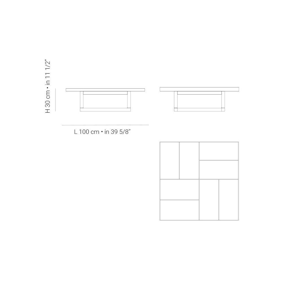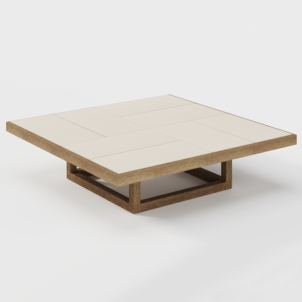 Low garden table made with Iroko wooden base and stoneware slab top. It comes from minimal and functional elements, whose character derives from the attention to detail and the proportions and combinations of horizontal and vertical elements. The design of its top is characterized by a linear geometric pattern obtained by combining different stoneware slabs that design the top, giving the table character and personality.