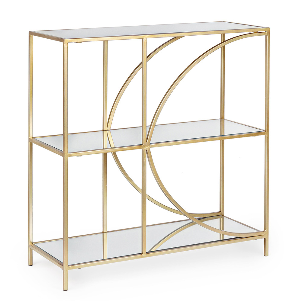 Low freestanding steel bookcase and 3 glass shelves of elegant design.